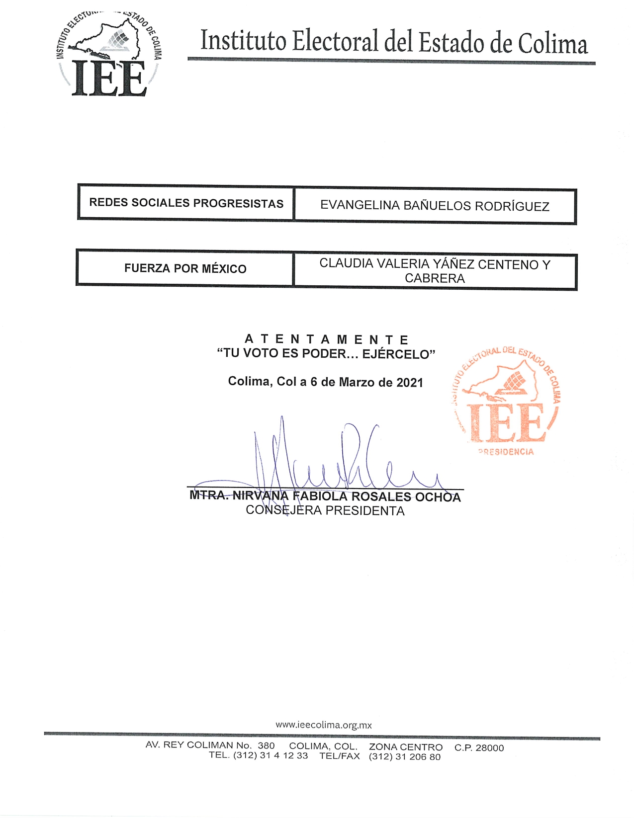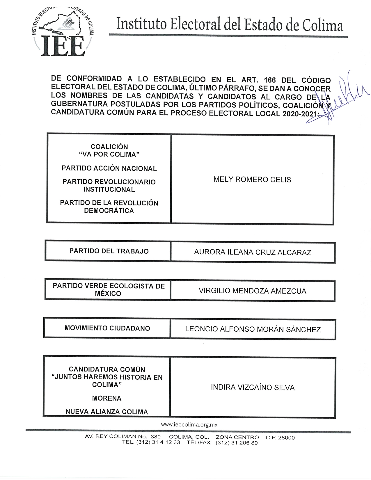 En ese sentido, las candidatas y candidatos al Gobierno del Estado de Colima son: Mely Romero Celis, por la Coalición “Va por Colima”, integrada por los partidos políticos Acción Nacional, Revolucionario Institucional y de la Revolución Democrática; Aurora Ileana Cruz Alcaraz, por el Partido del Trabajo; Virgilio Mendoza Amezcua, por el Partido Verde Ecologista de México; Leoncio Alfonso Morán Sánchez, por Movimiento Ciudadano; Indira Vizcaíno Silva, por Morena y Nueva Alianza Colima, mediante el Convenio de Candidatura Común “Juntos Haremos Historia en Colima”; Evangelina Bañuelos Rodríguez, por Redes Sociales Progresistas; y Claudia Valeria Yáñez Centeno y Cabrera, Fuerza por México.