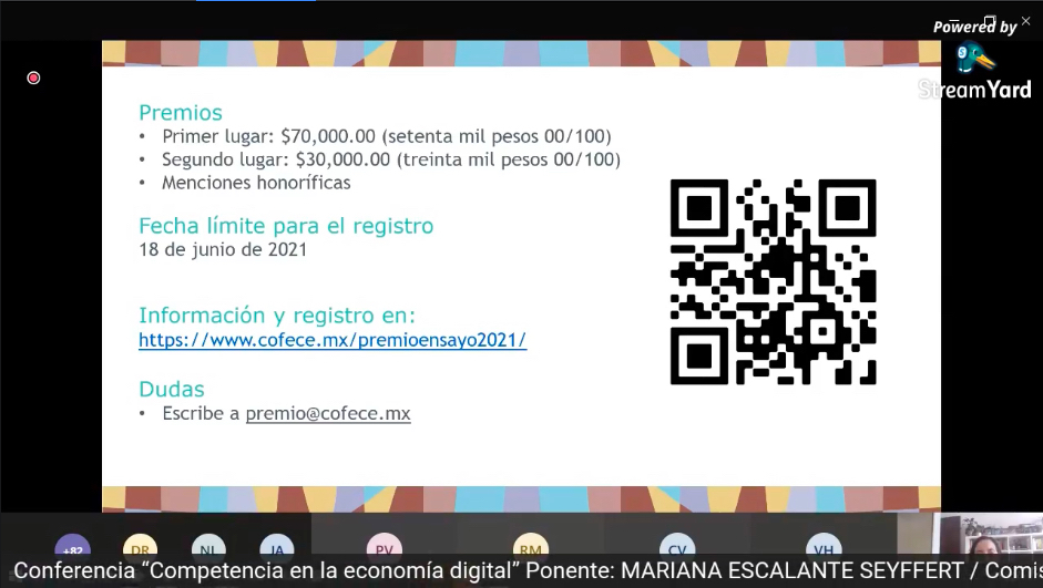Por otra parte, Mariana Escalante informó a la comunidad universitaria que este 2021 el mencionado organismo federal lanza su 4ª Edición del Premio COFECE de ensayo, está dirigido a estudiantes de licenciatura de todas las universidades de México y de cualquier semestre. Detalló que pueden participar en el concurso estudiantes de manera individual o colectiva, en equipos de máximo tres integrantes y que el registro se encontrará abierto hasta el próximo 18 de junio.