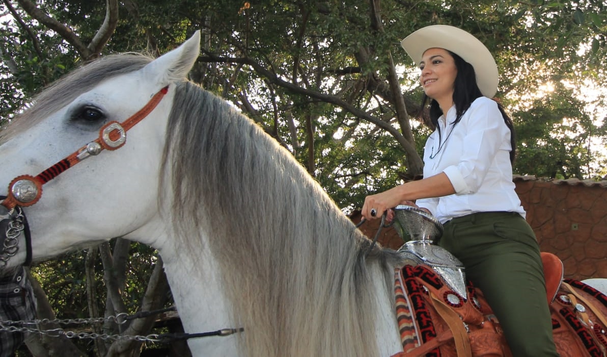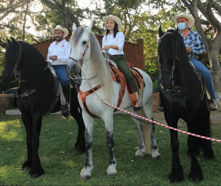 Durante su encuentro con Cuadras Unidas de Manzanillo, Mely Romero posó con Zeus, un caballo raza azteca, blanco con manchas, a petición de quienes conforman esta organización.