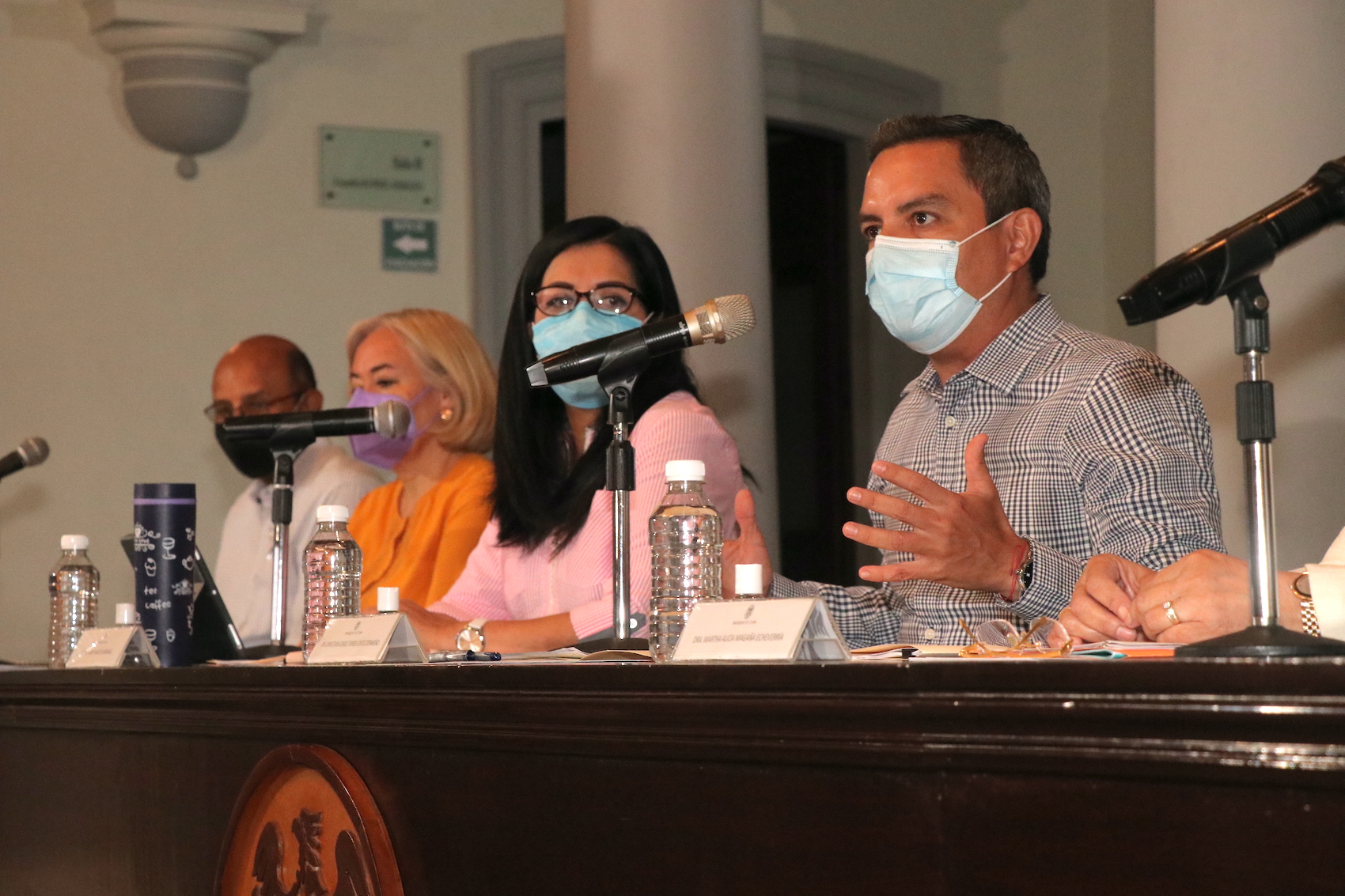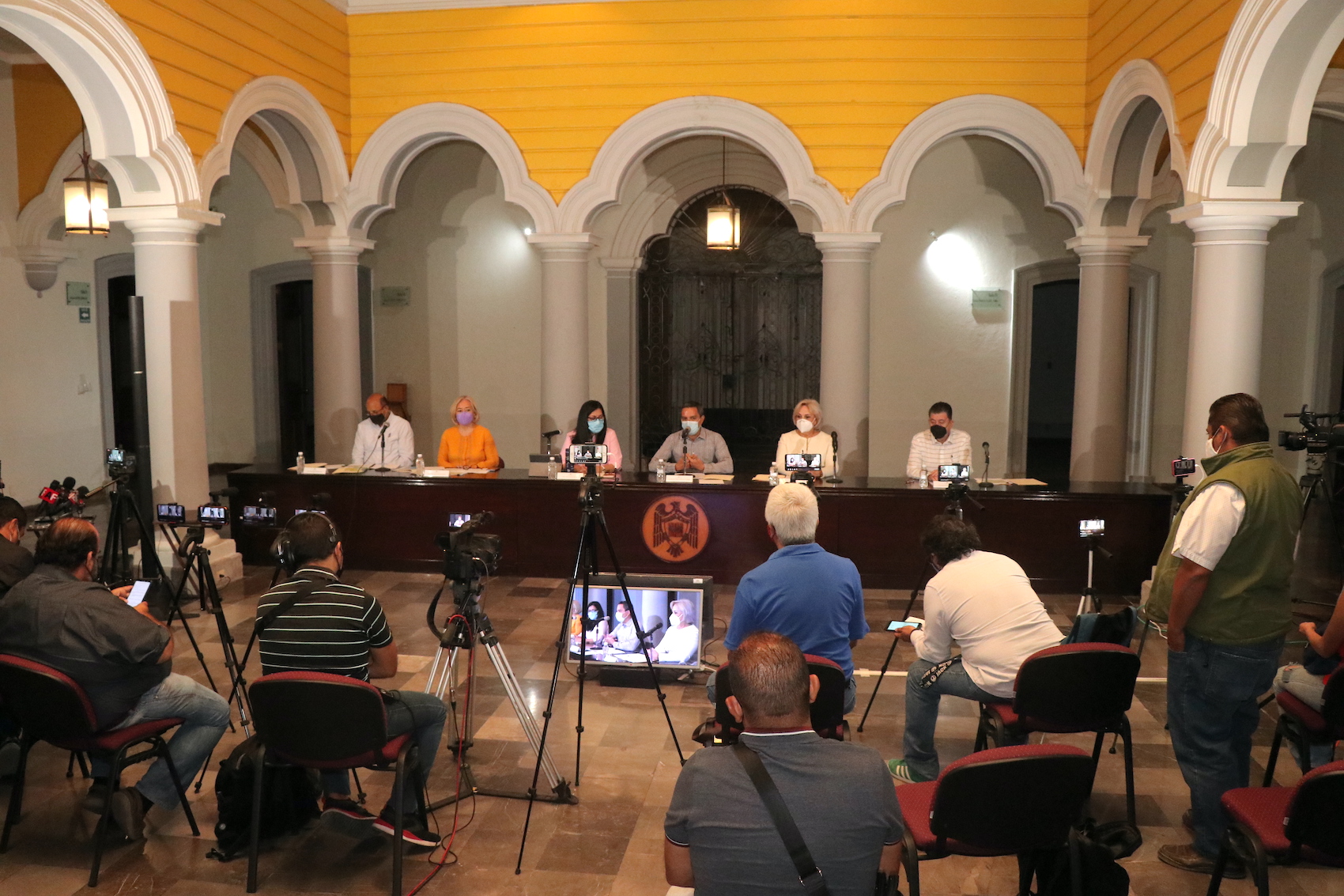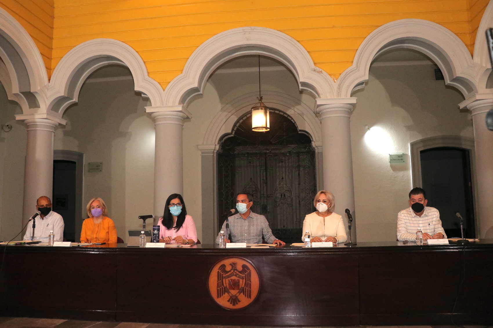 Acompañaron al rector en esta ruedad de prensa Vianey Amezcua, coordinadora general de Comunicación Social; Martha Alicia Magaña, coordinadora general de Docencia; Hugo Alfonso Barreto, director general de Administración Escolar; Arianna Sánchez Espinosa, directora general de Posgrado; Susana Aurelia Preciado, directora general de Educación Superior y Martín Jesús Robles, director general de Educación Media Superior.