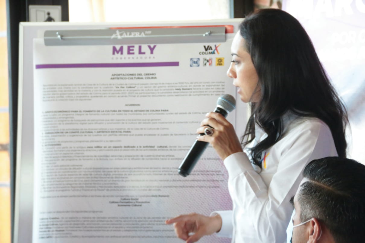 Colima, Col. 24 de mayo de 2021.- La candidata de la coalición Va por Colima al Gobierno del estado, Mely Romero Celis, firmó acuerdos con la comunidad artística y cultural, con quienes se comprometió a impulsar un programa integral de fomento cultural en todos los municipios y sus comunidades rurales, apoyando artistas consolidados y emergentes.