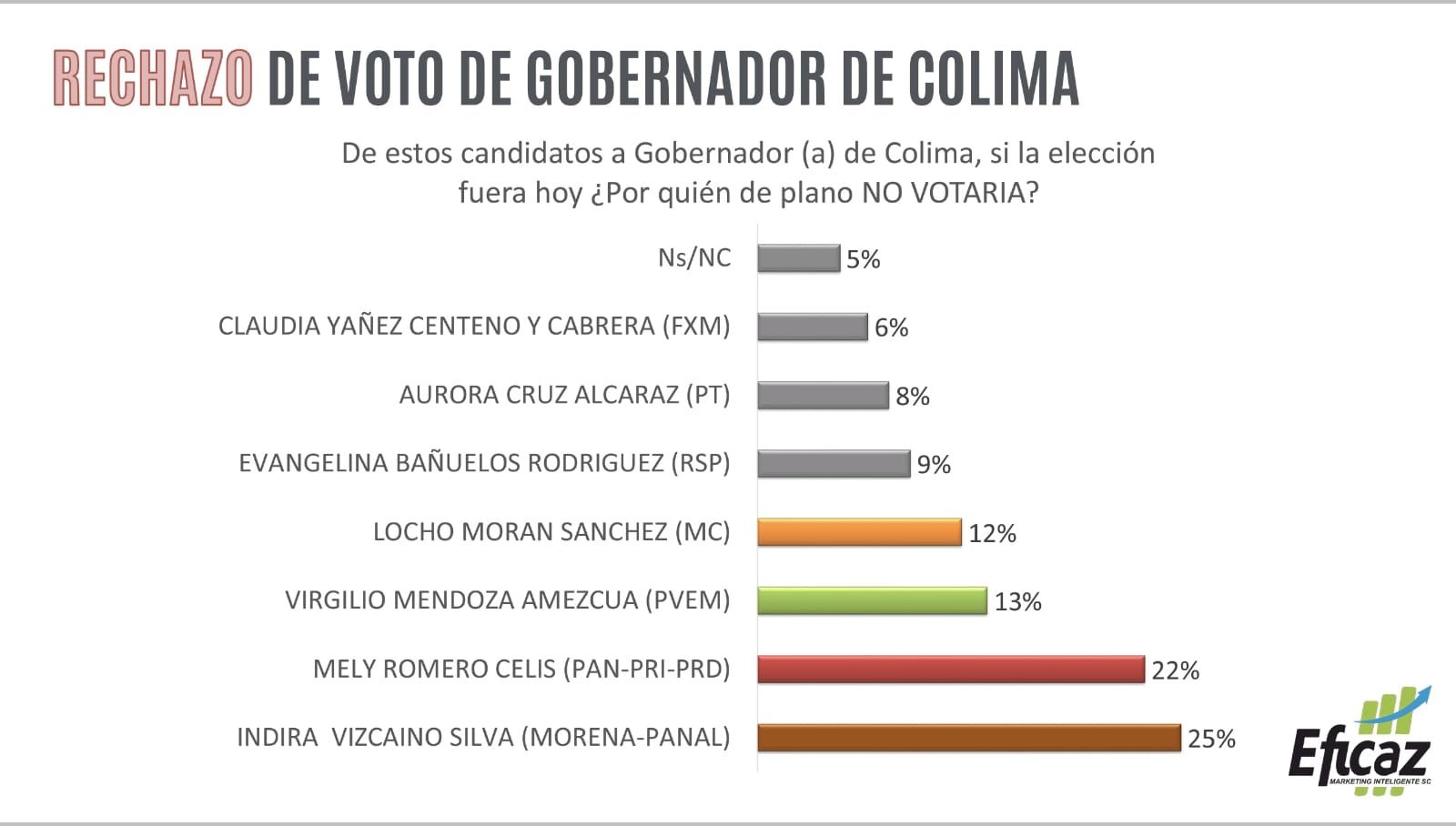 En el apartado del rechazo a los candidatos con la pregunta: Si la elección fuera hoy ¿Por quién de plano NO votaría? Indira Vizcaíno obtiene un negativo de 25%, seguida de Mely Romero con un 22%, Virgilio Mendoza con un 13% mientras que Locho Morán obtiene 12%.