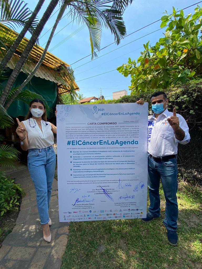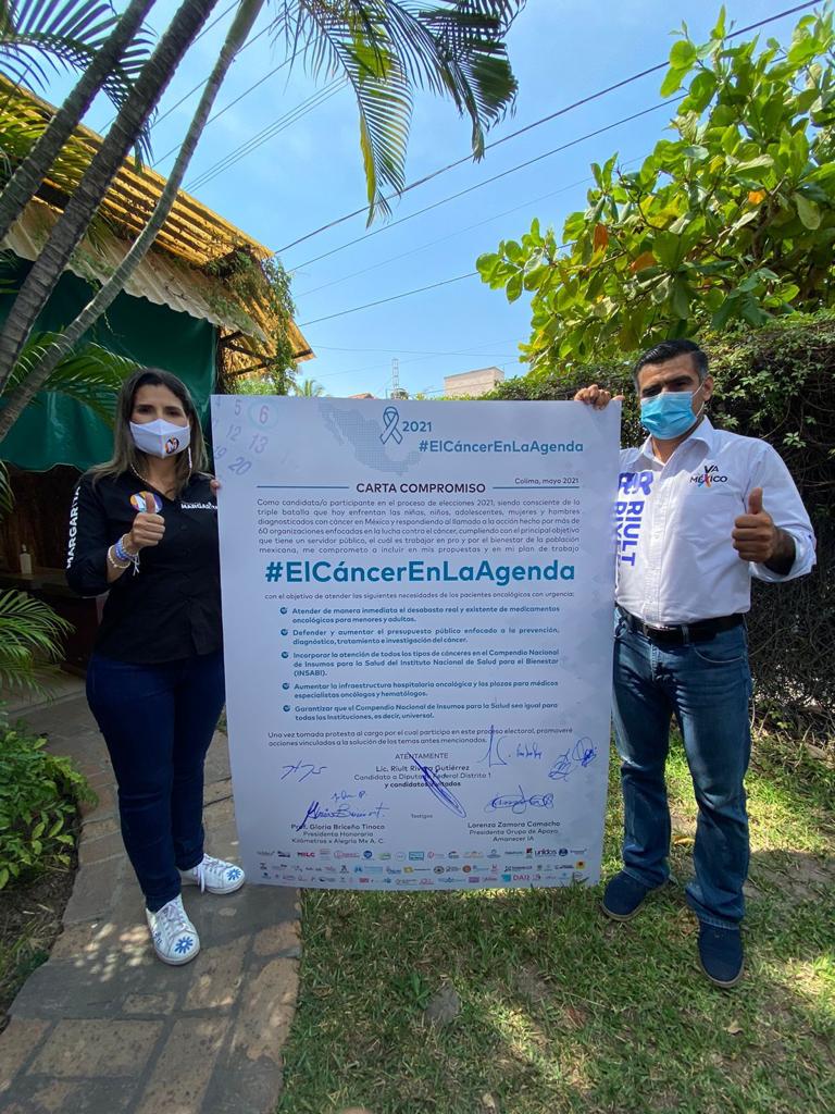 El abanderado de la Coalición “Va por Colima” para la Diputación Federal por el Distrito l, Riult Rivera Gutiérrez, acompañado de sus compañeras y compañeros candidatos, Margarita Moreno, Gabriela Mejia, Esther Gutierrez, Lizzie Moreno, Fernanda Salazar, Teresa Guerrero y Jesus Dueñas, atendiendo a el llamado por parte del Mtro. Kenji López Cuevas, Presidente de Cáncer Warrior México para la firma de compromisos para impulsar iniciativas que promuevan la lucha contra el Cáncer, tal como se presenta el programa “El cáncer en tu agenda”.
