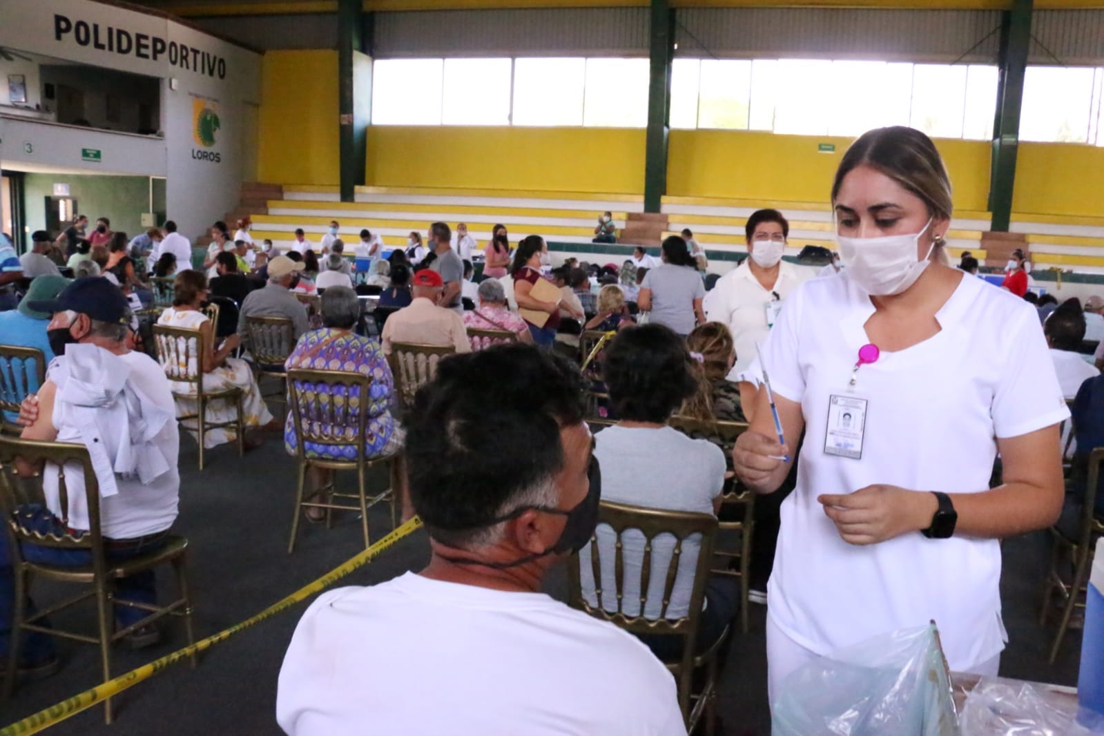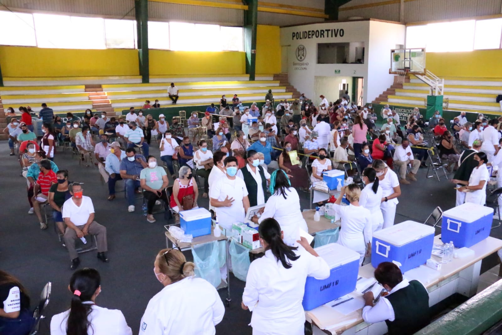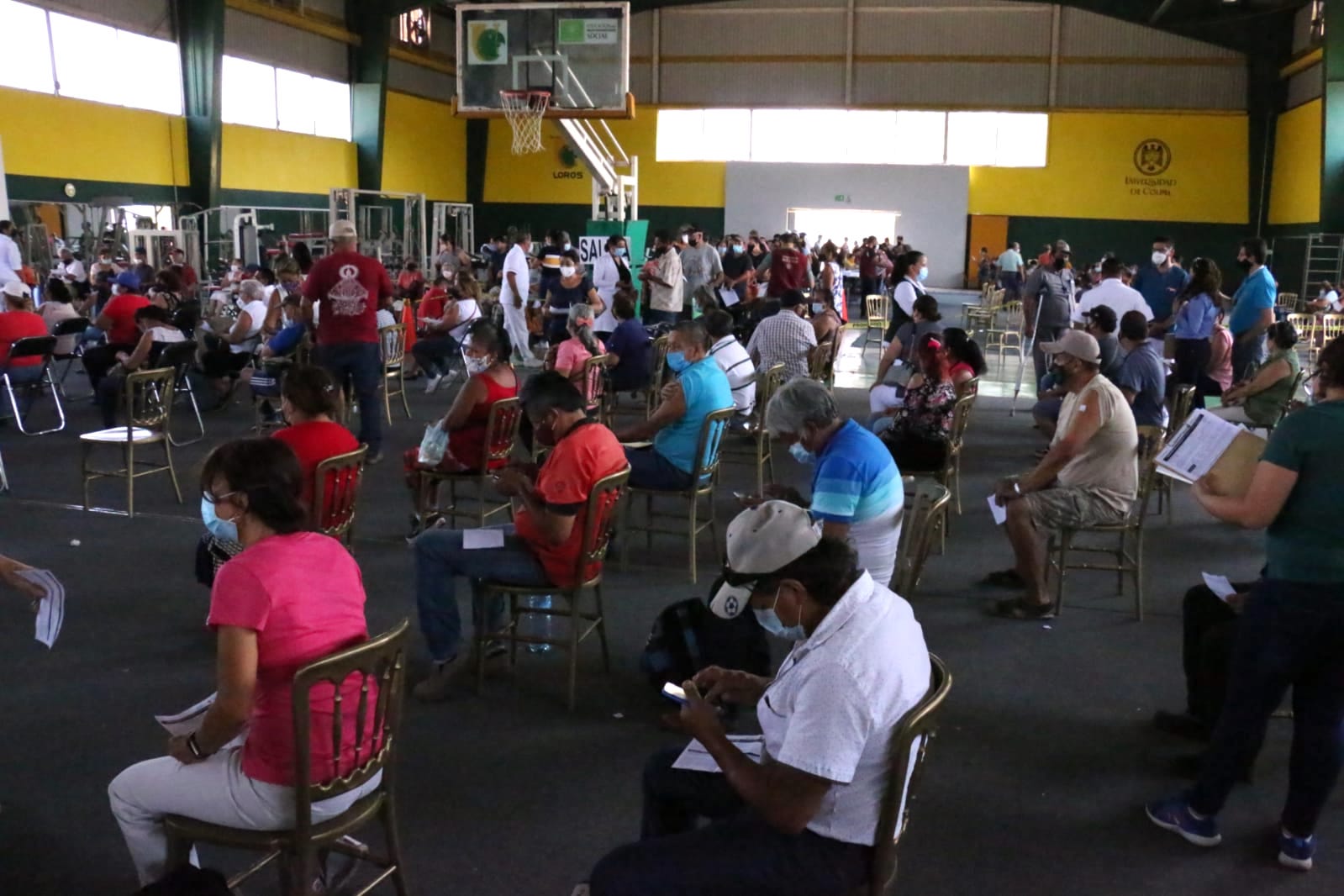 Este domingo, de nueva cuenta el Polideportivo central de la Universidad de Colima fue sede para que personas mayores de 50 y de 60 años, así como mujeres embarazadas mayores de 18 años, recibieran la primera dosis de la vacuna AstraZeneca contra el virus SARS-Cov2.