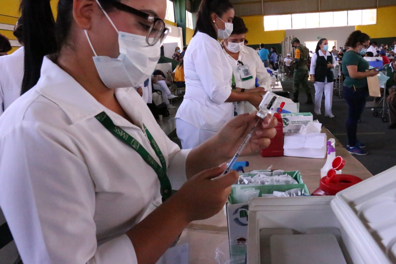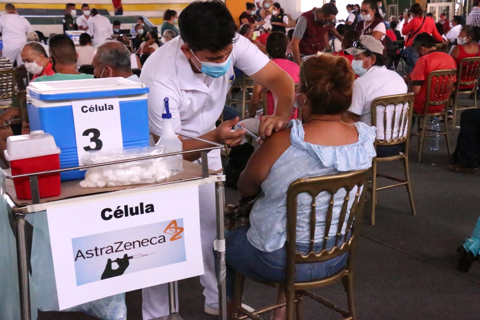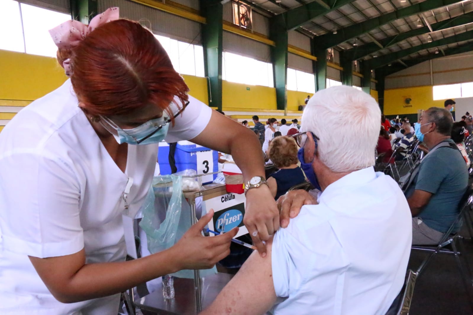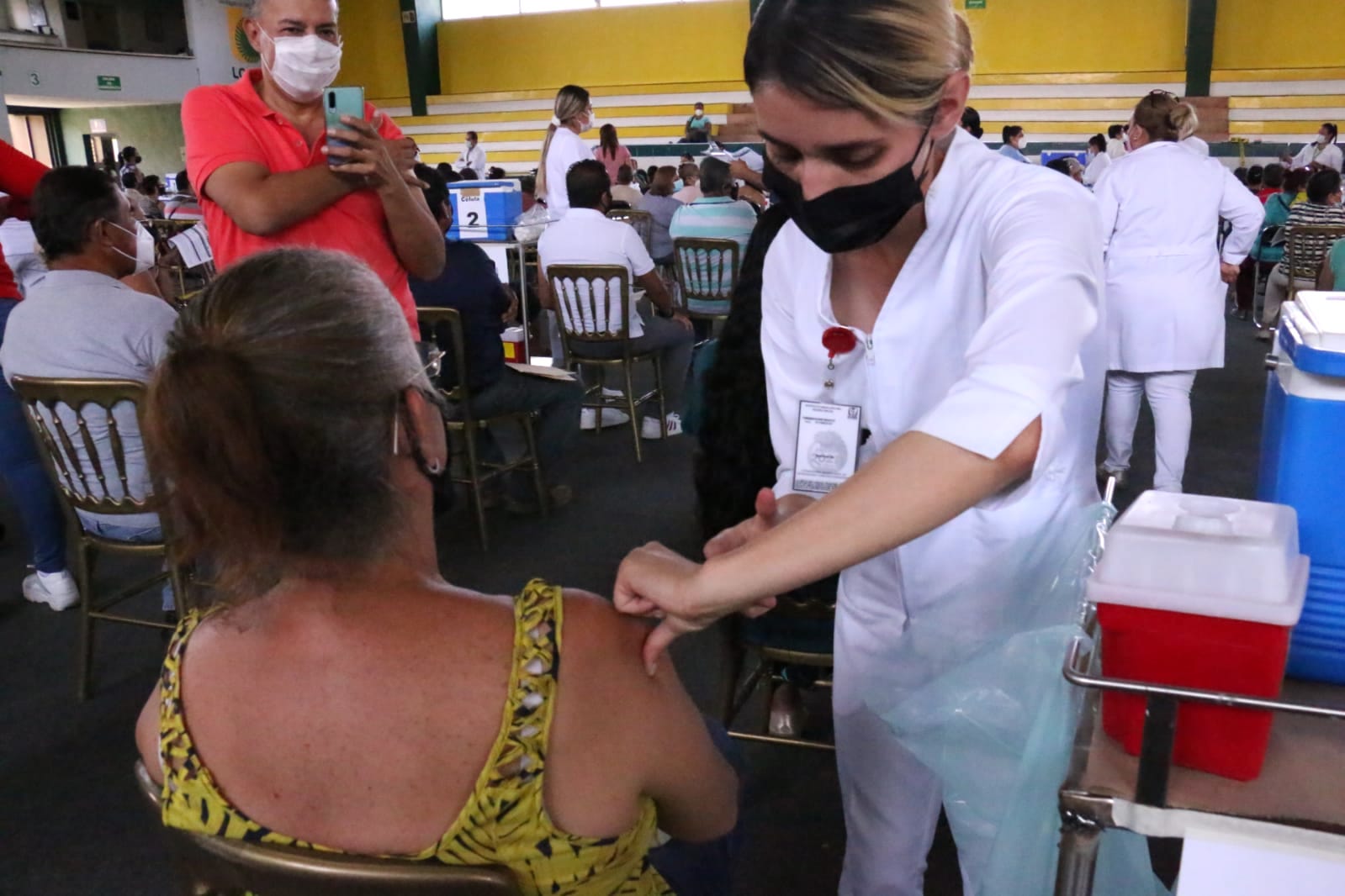 Este domingo, de nueva cuenta el Polideportivo central de la Universidad de Colima fue sede para que personas mayores de 50 y de 60 años, así como mujeres embarazadas mayores de 18 años, recibieran la primera dosis de la vacuna AstraZeneca contra el virus SARS-Cov2.