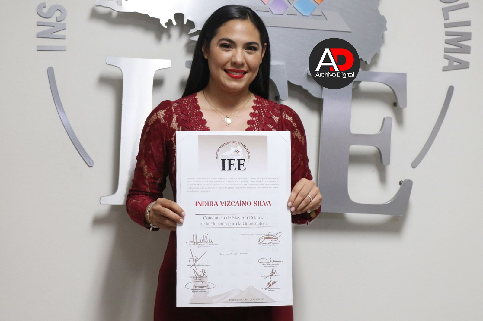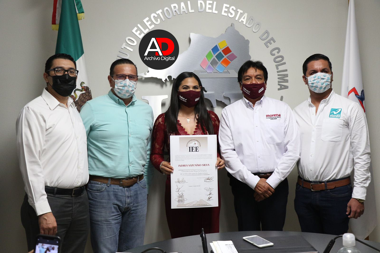 Luego de que el Consejo General del Instituto Electoral del estado de Colima llevara a cabo el cómputo estatal de la elección para la gubernatura, su presidenta Nirvana Rosales Ochoa, entregó la constancia de mayoría a Indira Vizcaíno Silva de la candidatura común Morena-Nueva Alianza como gobernadora electa.