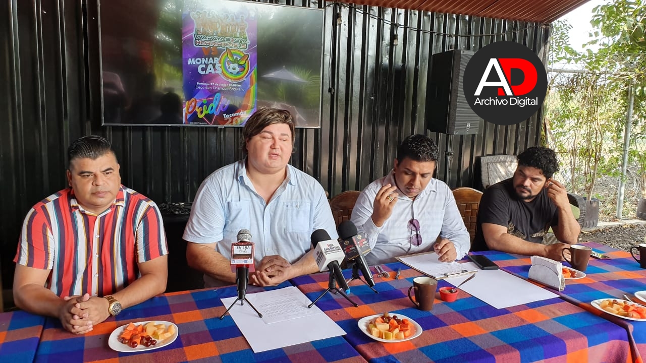 Ángel Novela Chávez presidente de la Asociación Unidos por la Diversidad del Valle de Tecomán, A.C., acompañado por Roberto Lepe, presidente del club deportivo Monarcas, Cristhian Venegas López y Adolfo Ferreira, integrante de la comunidad, dieron a conocer la programación de eventos a realizarse para celebrar este mes del orgullo.