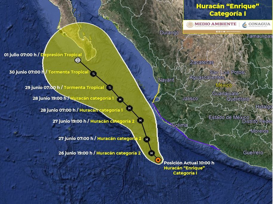 El Huracán “Enrique” se mantiene como categoría I en la escala de Saffir-Simpson, su centro se localiza al suroeste de las costas de Michoacán. Las bandas nubosas de este sistema producen lluvias intensas a torrenciales sobre el occidente y sur del territorio nacional. Las lluvias indicadas podrían generar deslaves, desbordamiento de ríos e inundaciones en partes bajas de terreno.