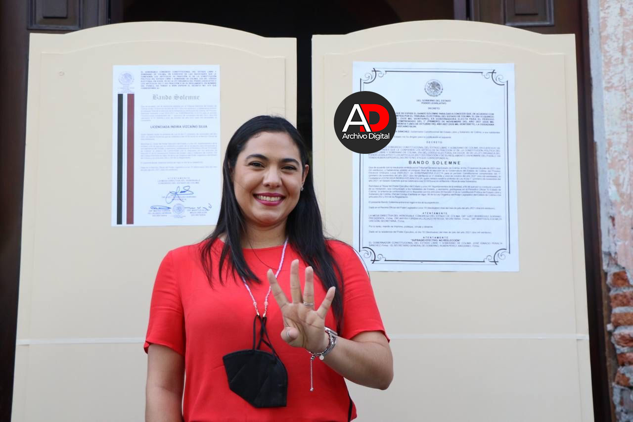 “De acuerdo con la resolución emitida por el Tribunal Electoral del Estado de Colima, el 15 de julio del 2021 y habiéndose emitido el cómputo final de la elección de la Gubernatura del Estado de Colima, del Proceso Electoral Ordinario Local 2021-2021, es Gobernadora Electa para el periodo que comprende el 1 de noviembre del 2021 al 31 de octubre del 2027”, se lee en el bando.