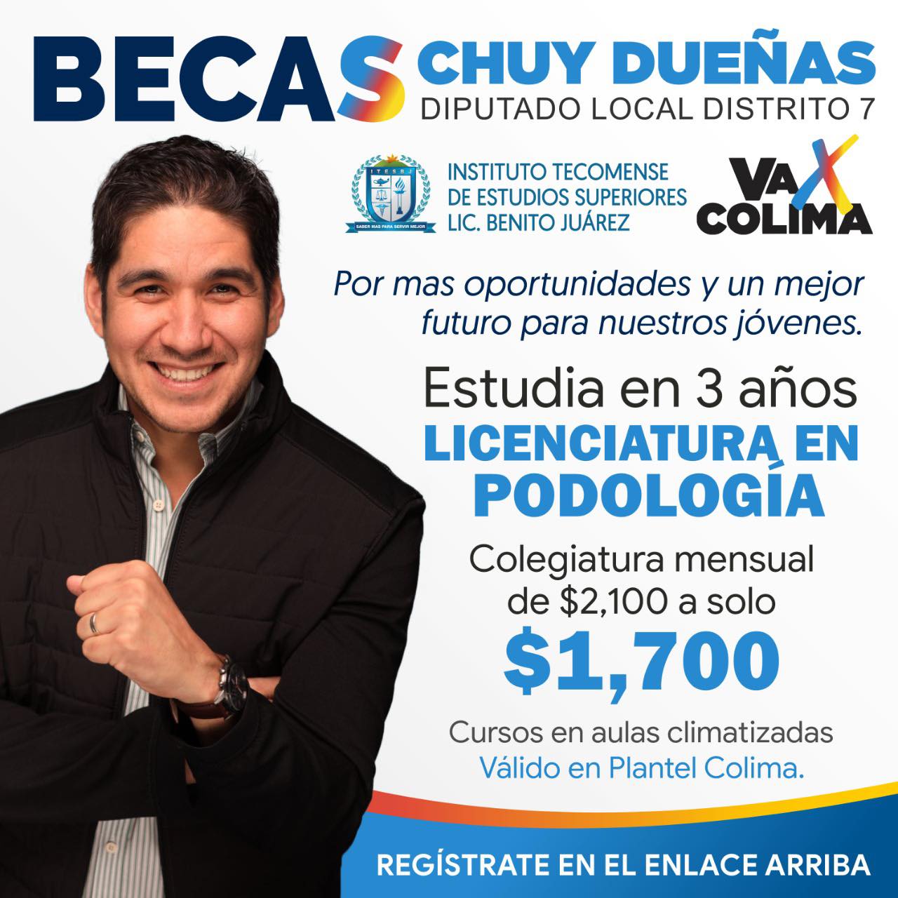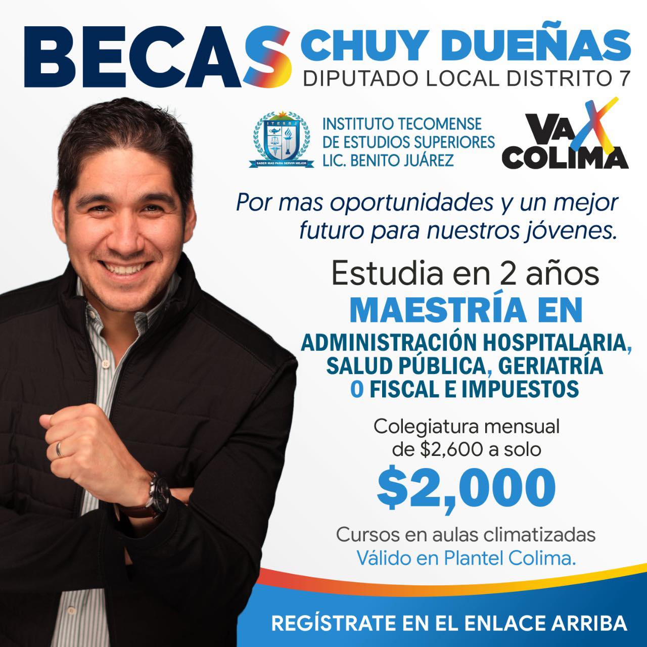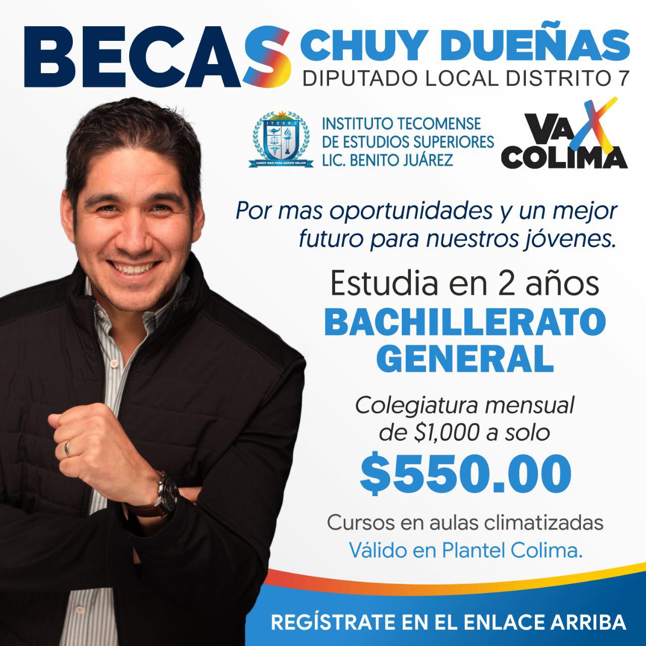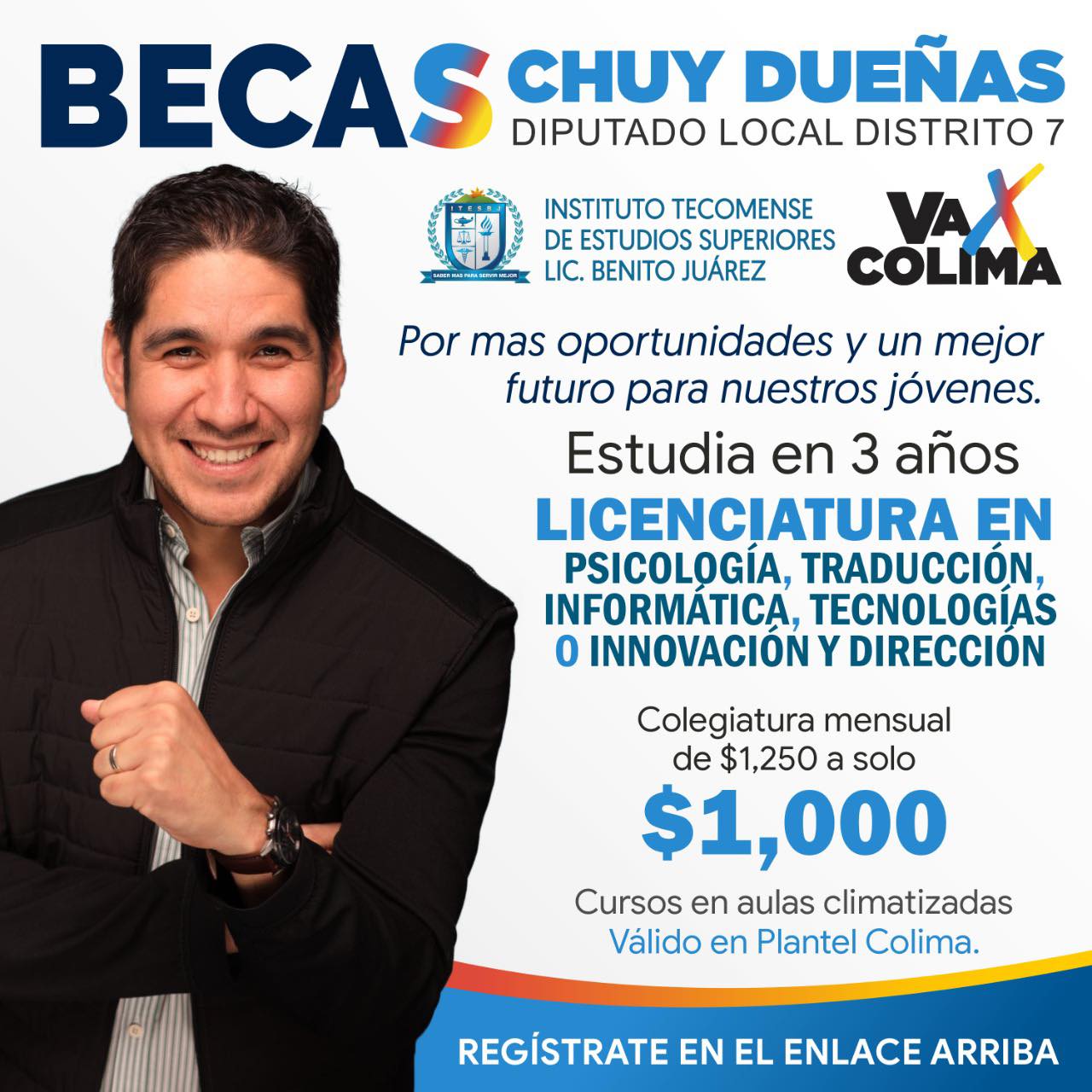 El Diputado Local Distrito 7, Chuy Dueñas, junto con el Instituto Tecomense de Estudios Superiores “Lic. Benito Juárez” traen un programa de becas para apoyar tanto a jóvenes y personas adultas de Colima con el fin de que puedan cursas o terminar sus estudios de bachillerato, preparatoria, licenciatura y maestría en diversas modalidades.
