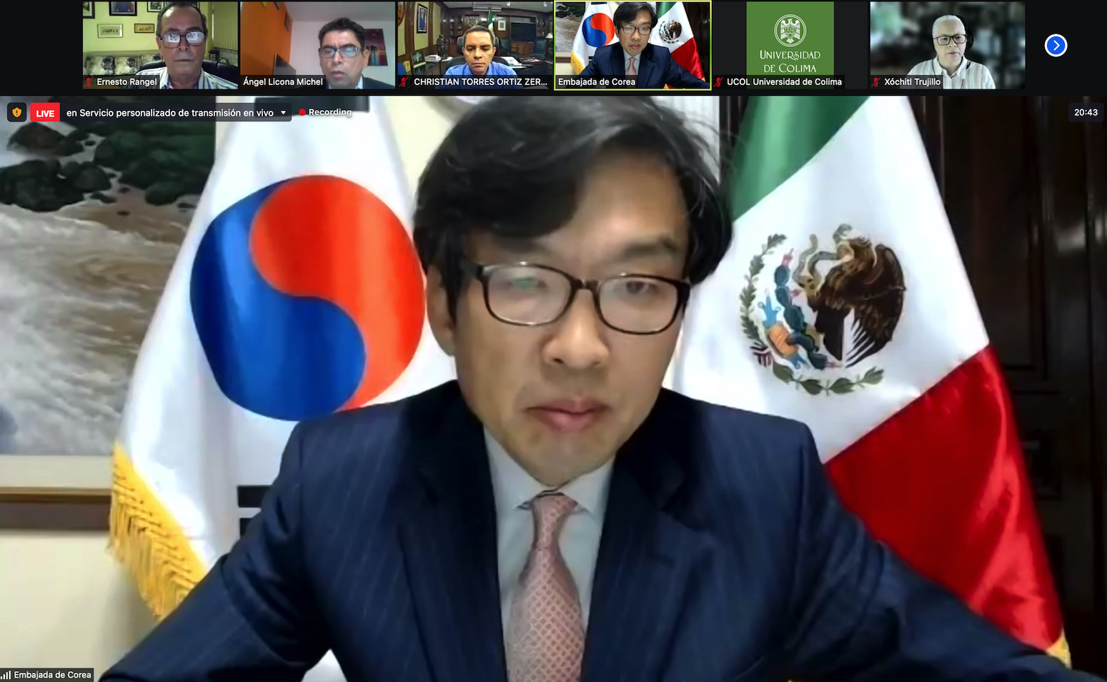 Después del acto inaugural, Jeong-in Suh, embajador de Corea del Sur en México, dictó la conferencia “México mira al Asia Pacífico”. En su presentación, dijo que a pesar de la llegada del COVID-19, Corea se convirtió en el mayor inversionista asiático de México, con 420 empresas coreanas y 150 mil empleos para mexicanos, alcanzando los 20 millones de dólares en 2020 y convirtiendo a Corea en el cuarto socio comercial de México.