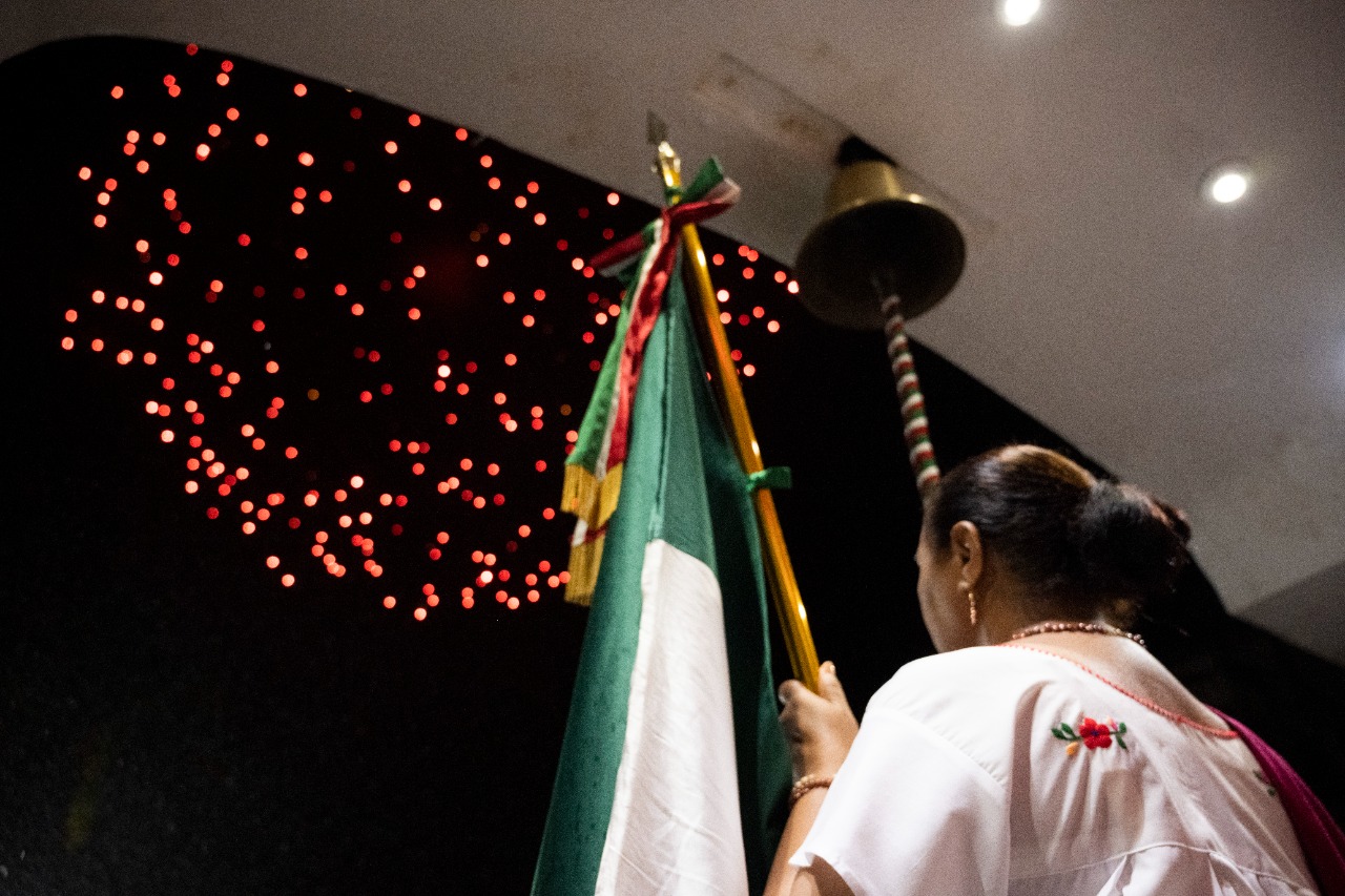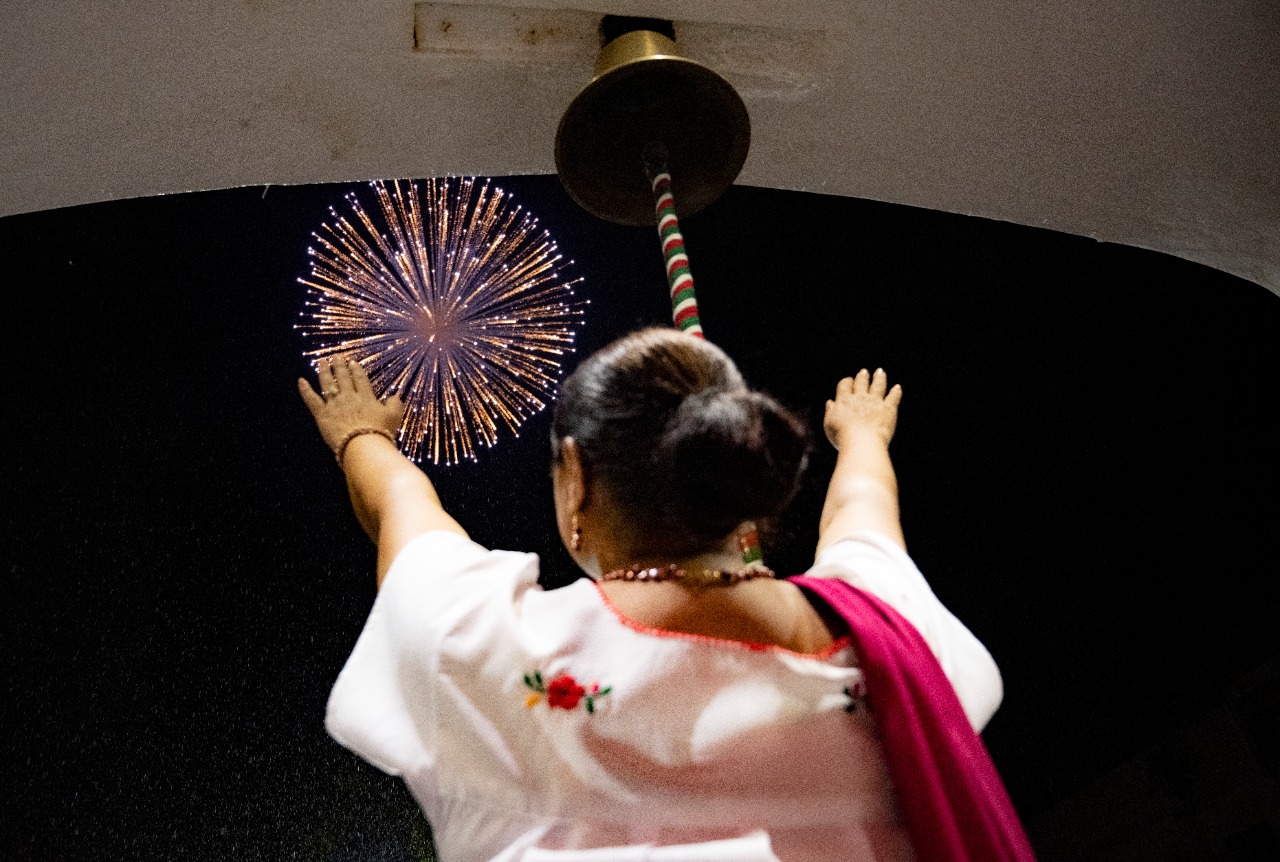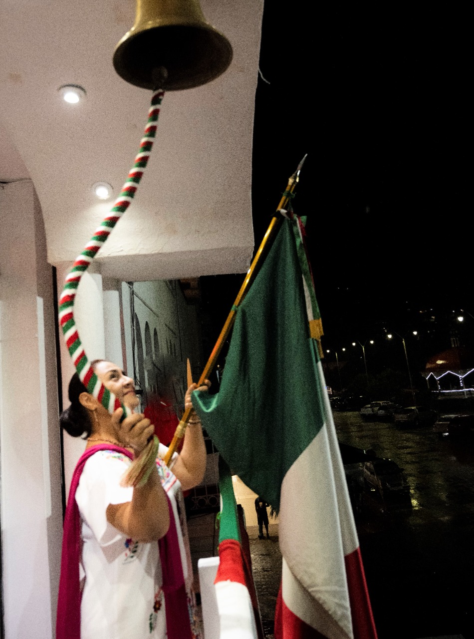 mandataria municipal hizo repicar la campana de Dolores y ondeó la bandera, para luego entonar el Himno Nacional.