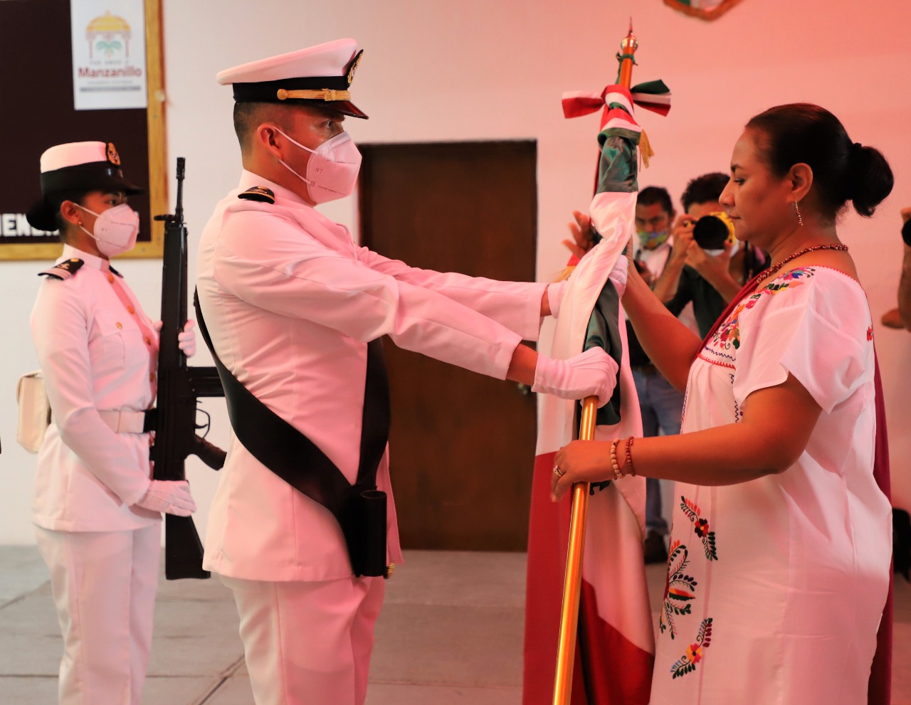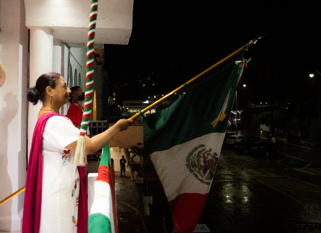 A las 11 de la noche, con la participación de la Banda de Guerra Manzanillo, la escolta de la Sexta Región Naval ingresó al recinto para entregar el lábaro patrio a la alcaldesa manzanillense quien, al tomarla, salió al balcón para vitorear: “¡Mexicanas y mexicanos, vivan nuestra independencia Nacional. Vivan los héroes que nos dieron patria y libertad. Viva Hidalgo. Viva Allende. Viva Doña Josefa Ortíz de Domínguez. Viva Leona Vicario. Viva Aldama. Viva el generalísimo Don José María Morelos. Viva el general Vicente Guerrero. Viva Simón Bolívar y el sentimiento latinoamericano. Vivan los desaparecidos hasta encontrarlos. Viva la paz. Viva la paz. Viva la paz. Vivan los valores que nos dan identidad. Viva la Cuarta Transformación. Viva México. Viva México. Viva México!”. La
