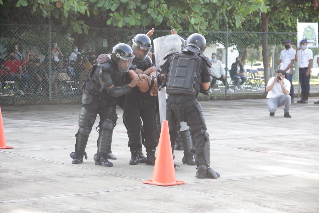 Ante las autoridades presentes, familiares y amigos, los cadetes egresados realizaron una demostración de reacción a una emboscada, medicina táctica, rosa de fuego y extracción en conato de riña en centros penitenciarios.