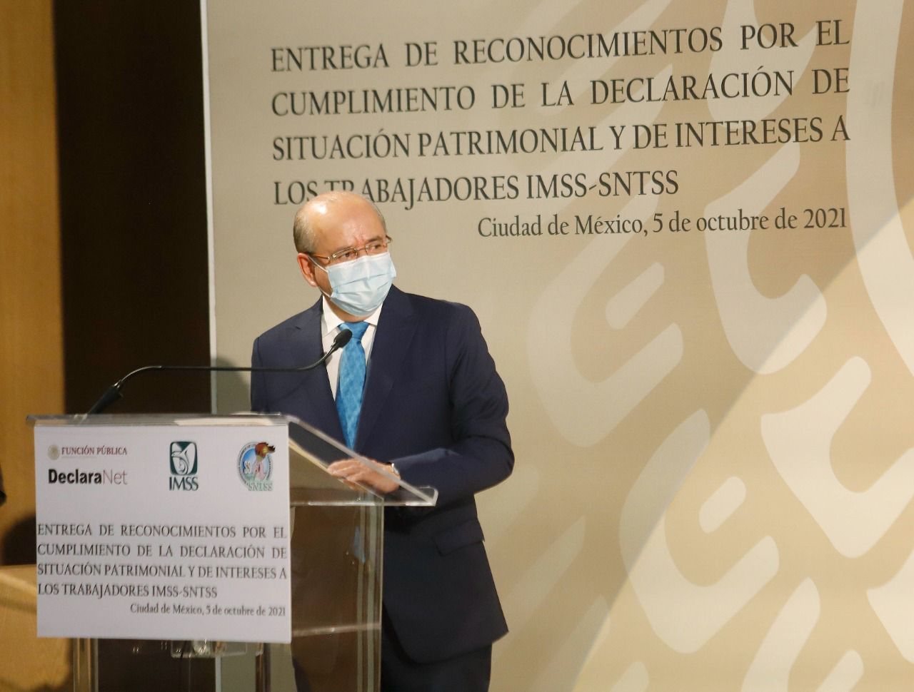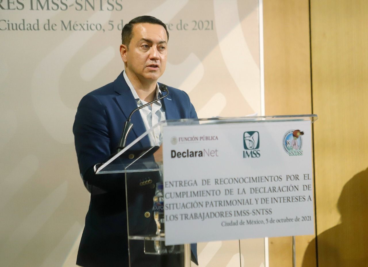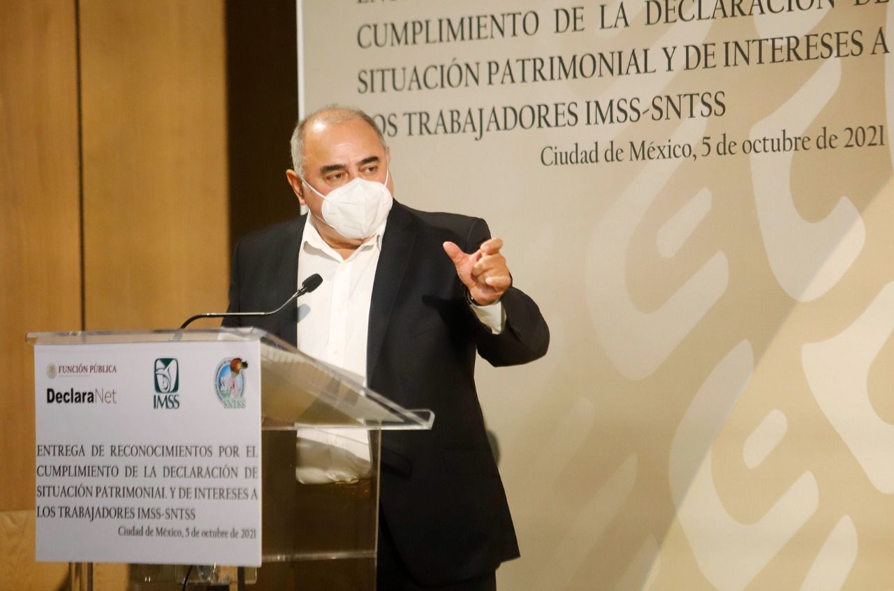 El Instituto Mexicano del Seguro Social (IMSS) recibió un reconocimiento de la Secretaría de la Función Pública (SFP) por cumplir con la entrega de la declaración patrimonial y de intereses 2021 de los trabajadores afiliados al Sindicato Nacional de Trabajadores del Seguro Social (SNTSS), y alcanzar el 99.90 por ciento de la meta, la mayor de la Administración Pública Federal.