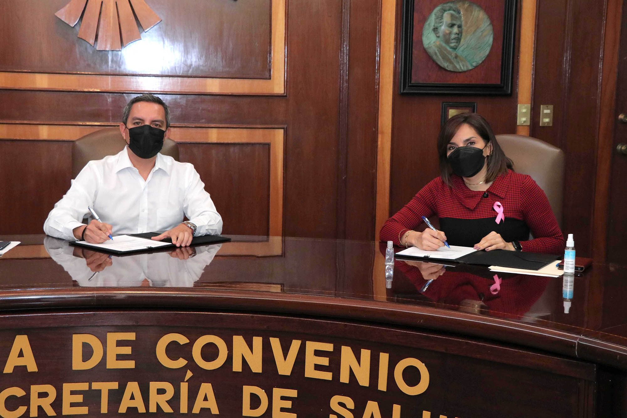 Atestiguaron la firma de convenio, por parte de la Secretaría de Salud, Yadira Azucena Martínez, directora de Servicios de Salud; Paloma Rodríguez, coordinadora de Asuntos Jurídicos y Roberto Rangel, subdirector de Calidad y Educación.