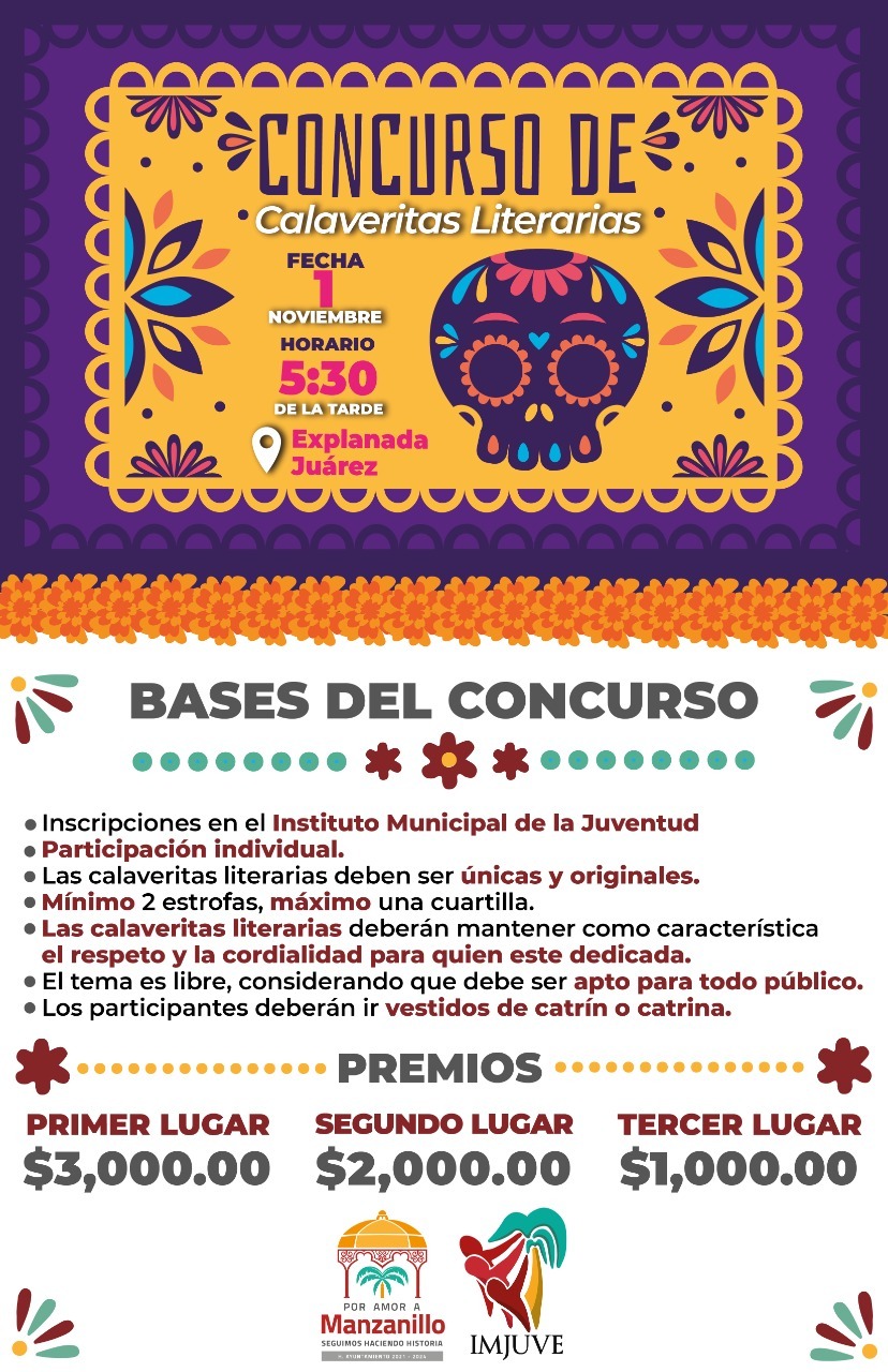 Y para seguir fortaleciendo nuestras tradiciones, el ayuntamiento de Manzanillo invita a participar en el Concurso de Calaveritas Literarias, que se llevará a cabo en la Explanada Juárez este 01 de noviembre a las 5 de la tarde, éstas deberán ser únicas y originales, de 2 estrofas como mínimo y una cuartilla como máximo, deberán mostrar respeto a quien se dedique y apta para todo público, el participante deberá acudir vestido de catrina o catrín, el primer lugar obtendrá 3 mil pesos, el segundo 2 mil y el tercero 1 mil pesos como premio.