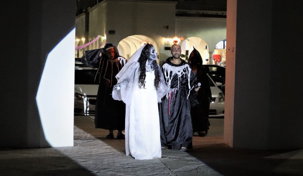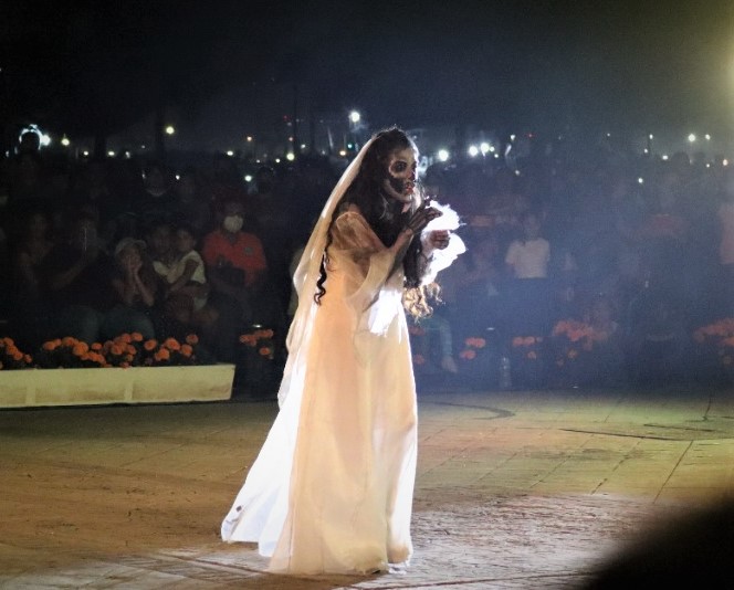 A invitación del Ayuntamiento de Manzanillo, a través del Instituto Municipal de Cultura, esta puesta en escena, encabezada por la actriz y promotora cultural del Faro Azcapotzalco, Lía Membrillo vestida de blanco pero con rostro, brazos, manos, hombros y espalda cadavéricas, se introdujo en la mirada y oídos de una asistencia copiosa que se dio cita la noche de este lunes en la explanada del Pez Vela.