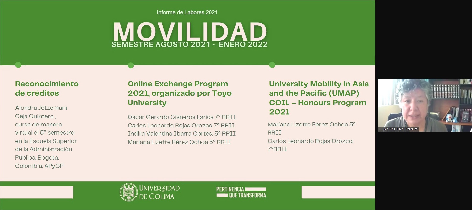 La virtualidad, agregó, también permitió a las y los estudiantes aprovechar otros programas de movilidad, por ejemplo, el programa de la UMAP (Movilidad Universitaria en Asia y el Pacífico) y de instituciones de Colombia; “sin duda hoy nuestro trabajo es virtual, y esa otra parte del trabajo está fundada en el trabajo de los docentes, que sin duda son otro de los grandes pilares de la Facultad, y quienes también están al pendiente de la evolución de los estudiantes”.