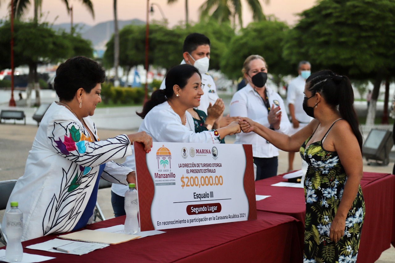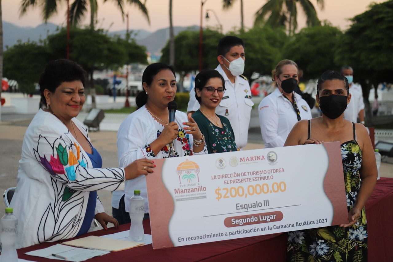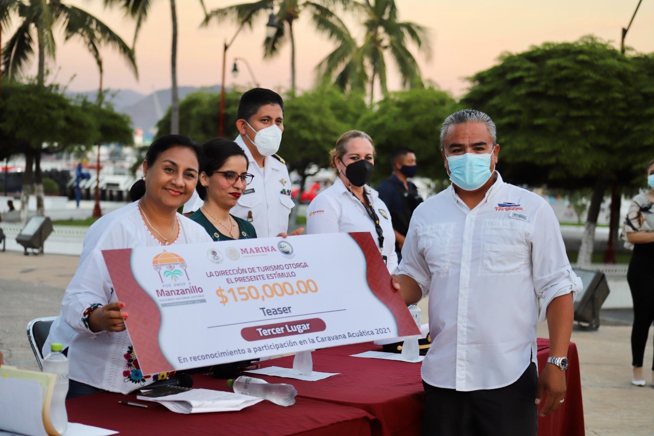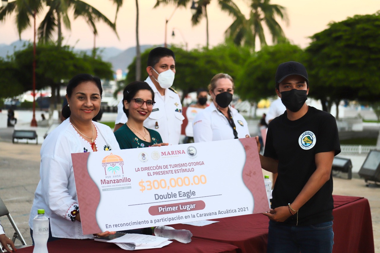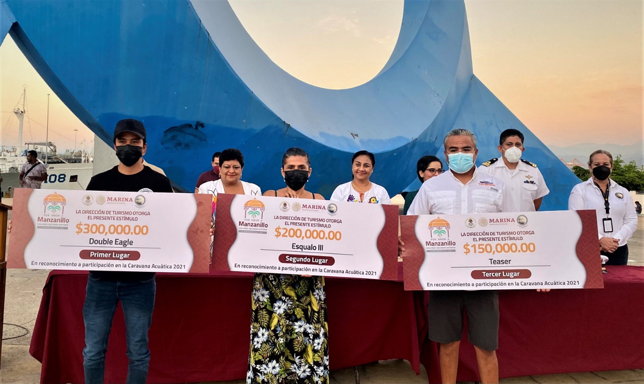 La tarde de este jueves en la explanada del Pez Vela se llevó a cabo la entrega de los premios a los ganadores de la Primera Caravana Acuática 2021 que se desarrolló el pasado 31 de diciembre. Entre los tres primeros lugares se entregó una bolsa económica de 650 mil pesos, siendo éstos para el primer lugar con 300 mil pesos de premio para Rubén Orozco García con la embarcación Double Eagle; el segundo lugar con 200 mil a Gerardo Montes Figueroa con Esqualo III y el tercer lugar con 150 mil pesos de premio fue para Cuauhtémoc Estrada Molina con Teaser.