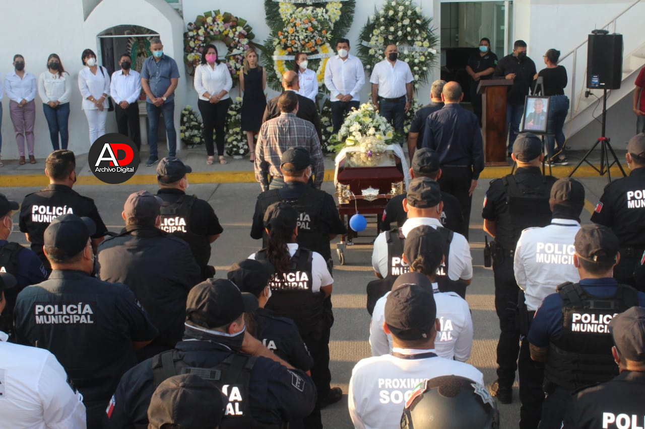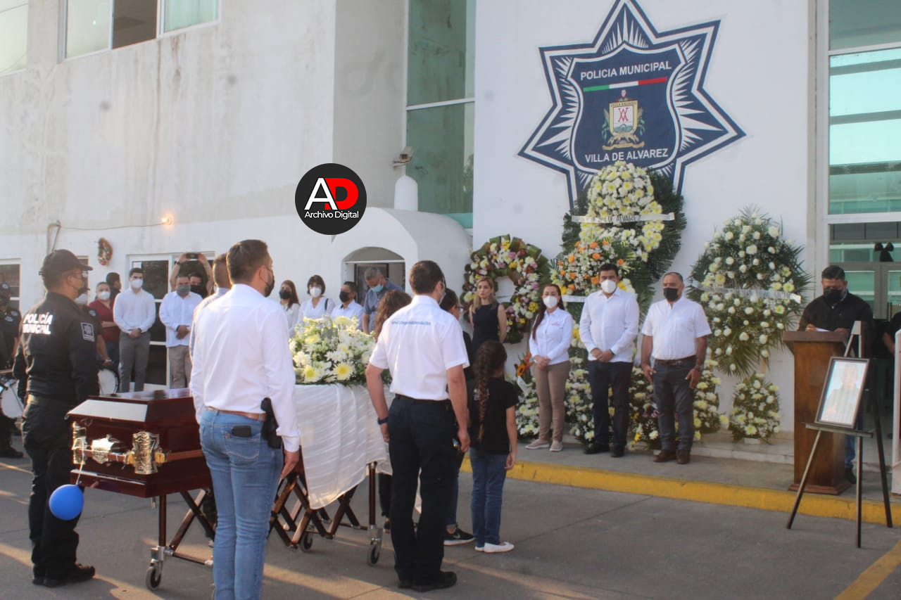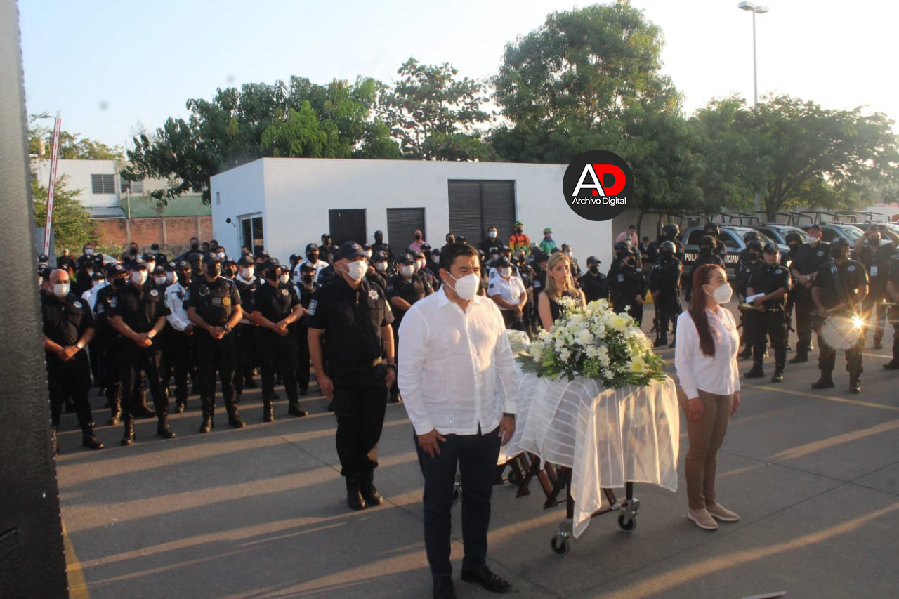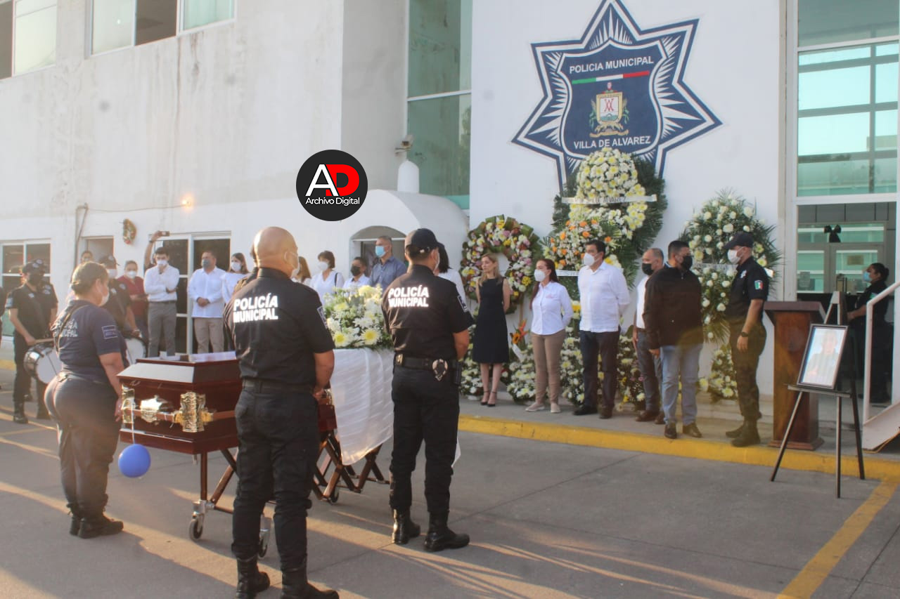 En el homenaje de cuerpo presente a José Luis Acevedo Nava, Comandante de las Fuerzas de Reacción de la Policía Municipal de Villa de Álvarez, la Presidenta Tey Gutiérrez y la Directora General de Seguridad Pública, Lourdes Pérez, anunciaron que la familia del policía ultimado no quedará desamparada.