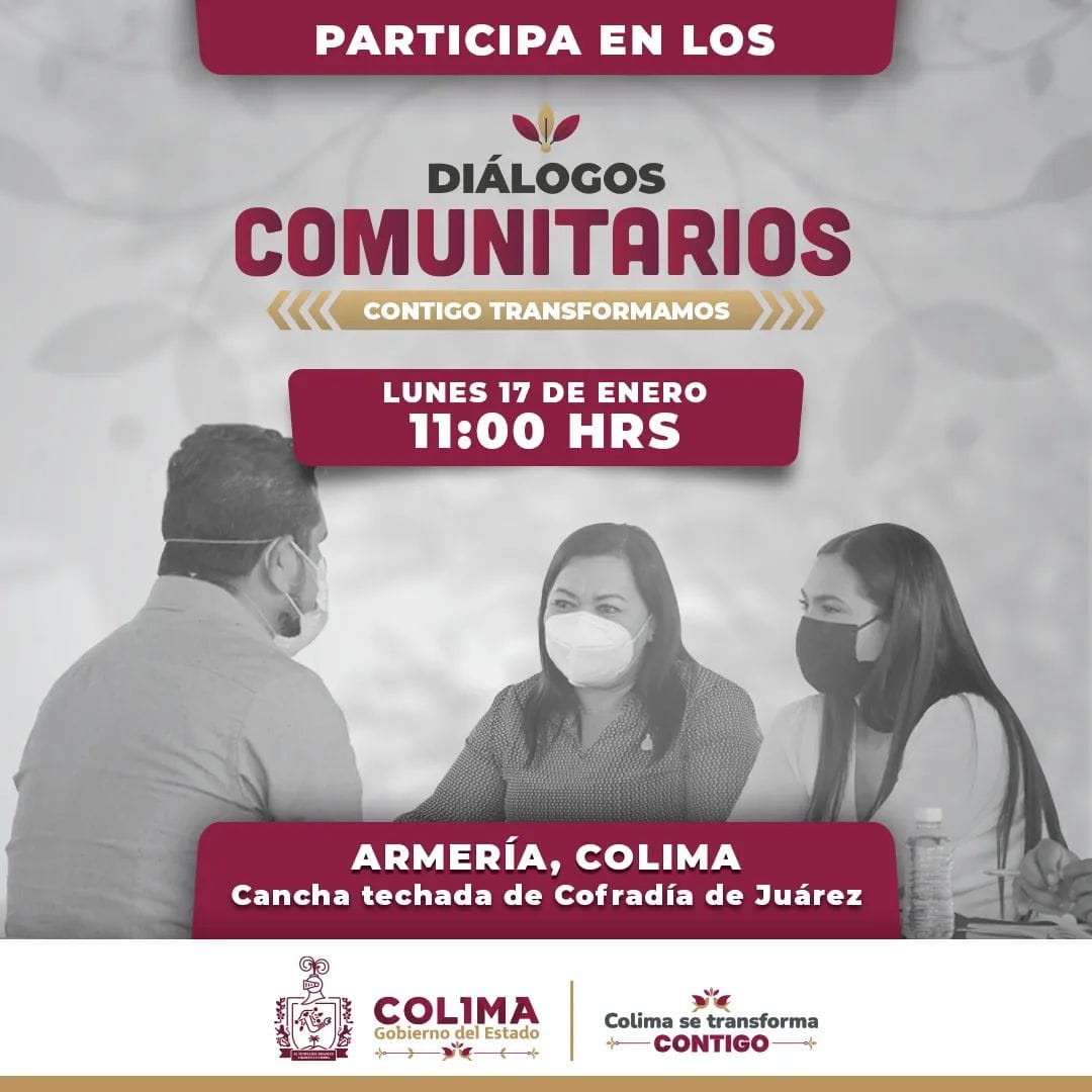 La gobernadora Indira Vizcaíno Silva presidirá este lunes los “Diálogos Comunitarios”, Contigo Transformamos”, que se realizarán en punto de las 11 de la mañana en la cancha techada de la comunidad de Cofradía de Juárez, en el municipio de Armería.