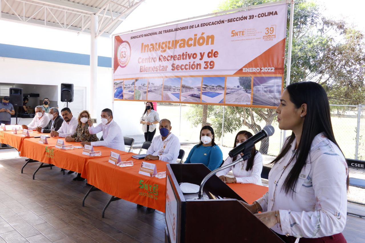 En la inauguración del centro recreativo de Manzanillo, José Jaime Núñez Murguía, secretario general de la Sección 6 del SNTE, reconoció y agradeció a la gobernadora por su intervención ante el Gobierno de México, para que Colima fuera el primer estado donde se aplicara el refuerzo de la vacuna contra el Covid-19 a trabajadores del sector educativo y le solicitó apoyo para atender sus diversas necesidades.