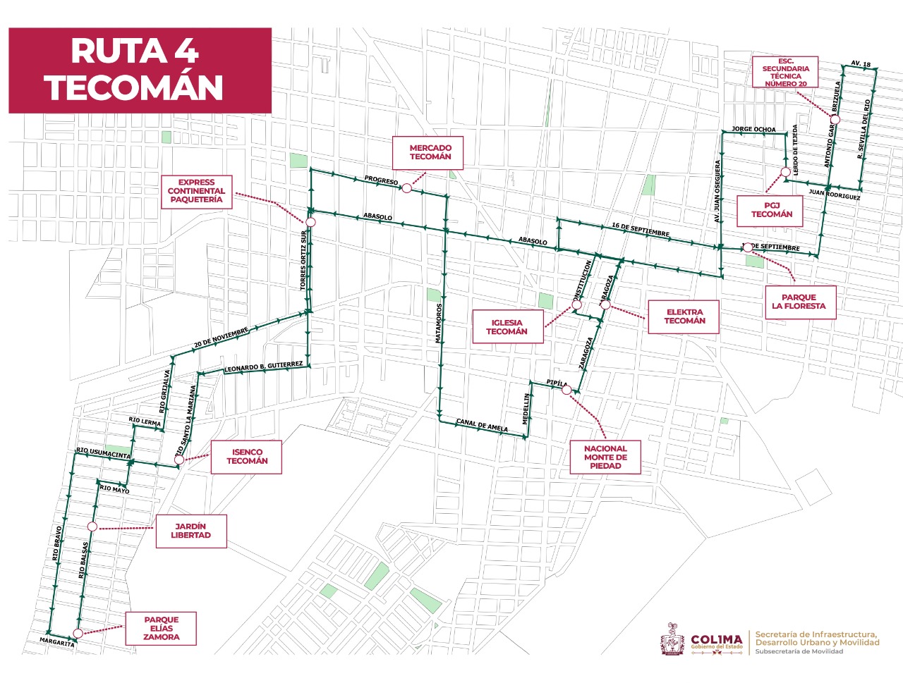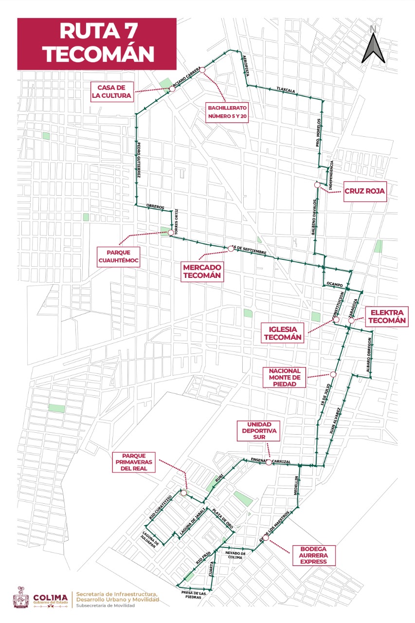El Gobierno del Estado de Colima, a través de la Subsecretaría de Movilidad, anuncia que las rutas 2, 4 y 7 del municipio tecomense se verán modificadas para adecuarse al cambio de sentido de vialidad, propuesto por el H. Ayuntamiento de Tecomán, cuyo cambio buscará agilizar la circulación en la zona centro de esta ciudad.