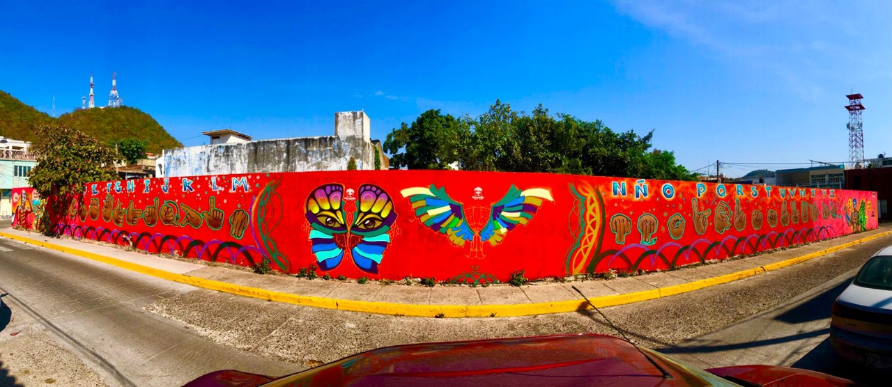 Esta obra de arte urbano es un retrato fiel de cada una de las señas que corresponden a las letras del abecedario y en el que también se encuentran presentes personajes de culto nacionales como el Santo y Blue Demon.