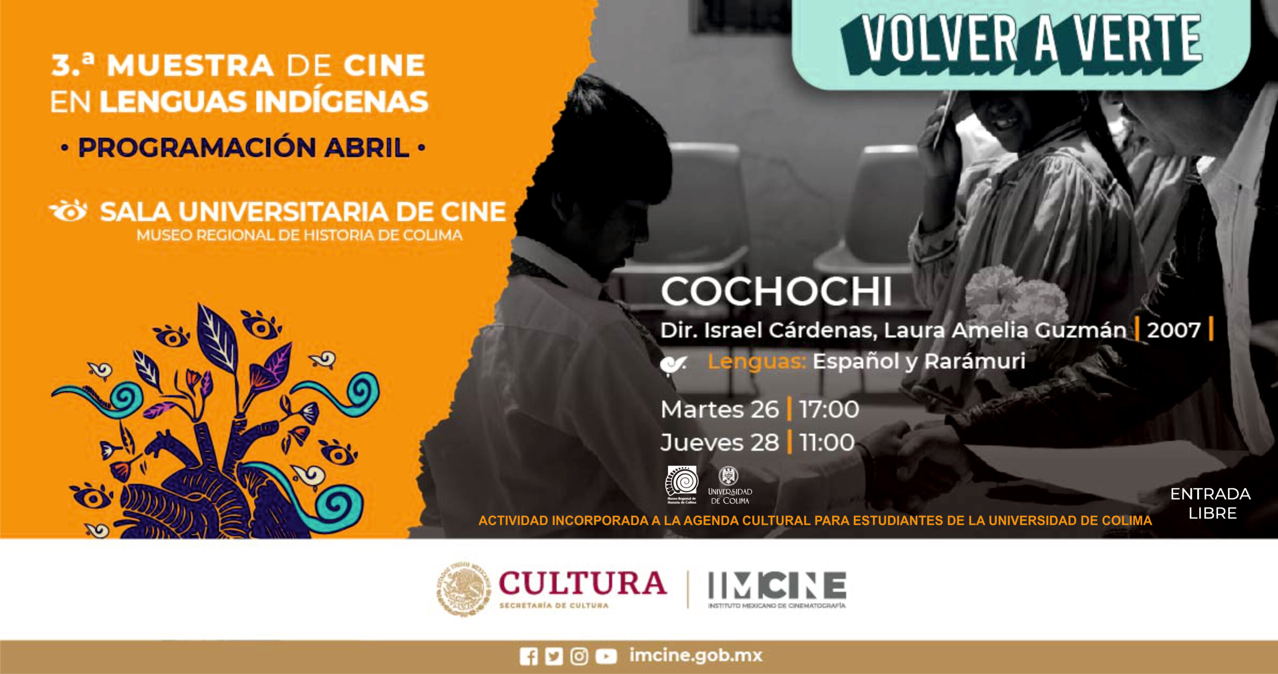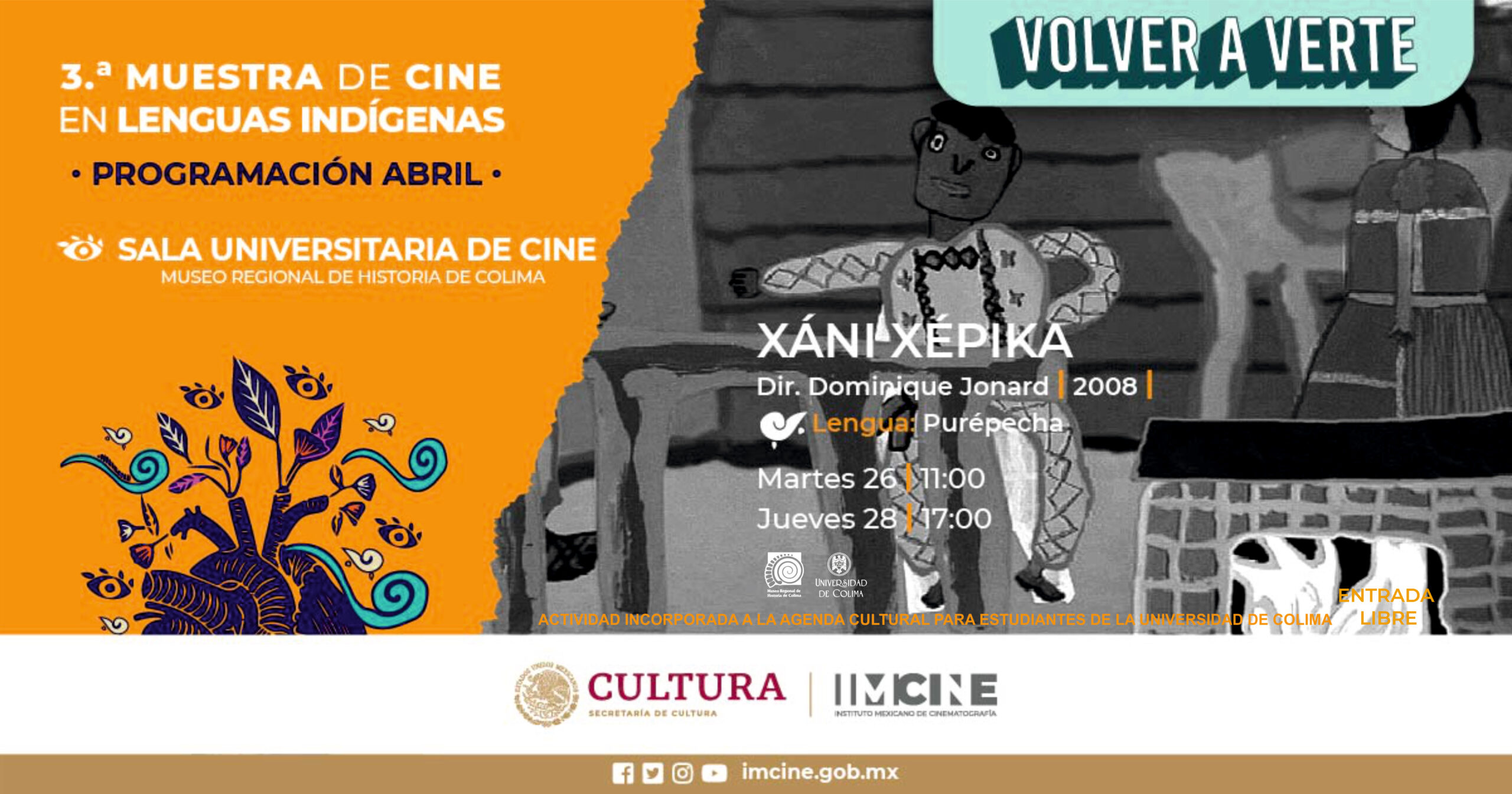 Gracias a la colaboración entre la Universidad de Colima, IMCINE y el INAH, la muestra está presente en la Sala Universitaria de Cine, ubicada al interior del Museo Regional de Historia de Colima, con cartelera de tres películas por mes e ingreso gratuito a cada función.