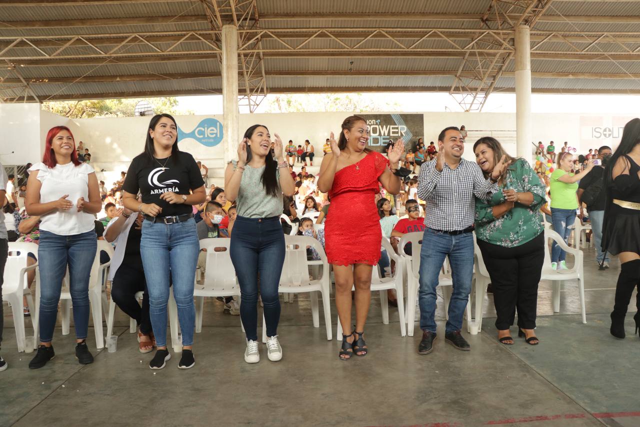 En el evento organizado por Gobierno del Estado, DIF Estatal, Ayuntamiento de Armería, el delegado de Programas para el Bienestar del Gobierno de México, Julio León Trujillo y la diputada local Sonia Hernández Cayetano, la mandataria estatal dijo a las y los niños de ese municipio que “los tenemos muy presentes en cada una de las decisiones que tomamos en este gobierno”.