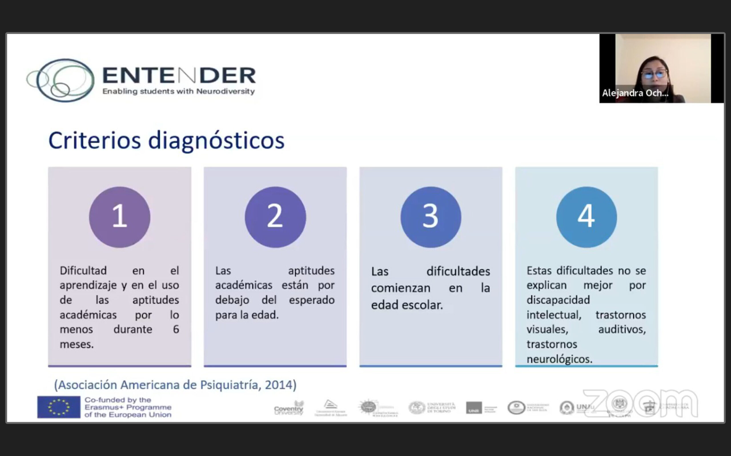 La ponente dijo que el trastorno del neurodesarrollo es un grupo de afecciones que producen deficiencias del funcionamiento personal, académico u ocupacional; “dentro de éstas se encuentran los trastornos específicos del aprendizaje, que son déficits en la capacidad del individuo para percibir o procesar información que impiden el aprendizaje de las aptitudes académicas”.
