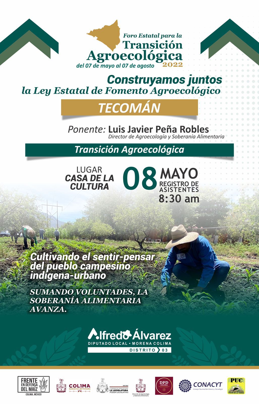 El segundo foro tendrá lugar en Tecomán, el domingo 8 de mayo, a las 8:30 horas, en las instalaciones de la Casa de la Cultura de ese municipio y contará con la participación de Luis Javier Peña Robles, Director de Agroecología y Soberanía Alimentaria del Estado de Colima.