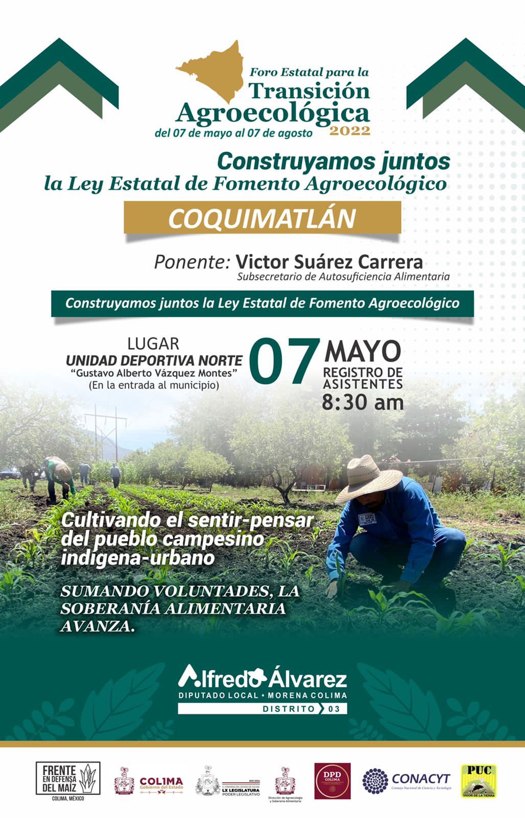 Con la presencia del Subsecretario de Agricultura y Desarrollo Rural del Gobierno de México, Víctor Suárez Carrera, este sábado 7 de mayo iniciará en Coquimatlán el primer foro para la creación de la Ley Estatal de Fomento Agroecológico, impulsada por el Diputado local de Morena, Alfredo Álvarez Ramírez.