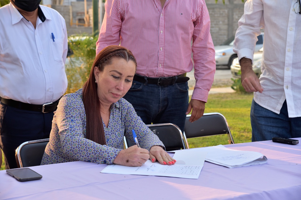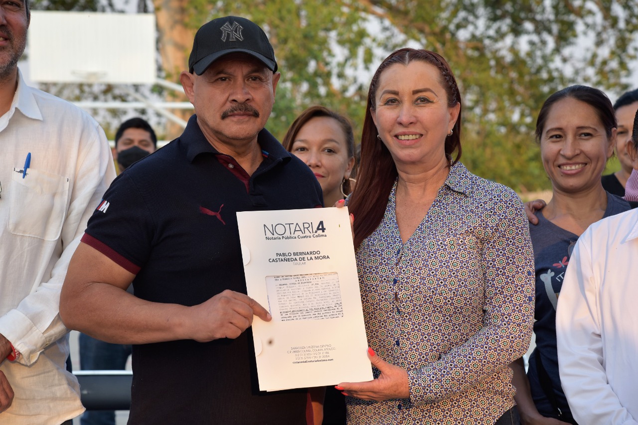 Villa de Álvarez, Col.- Ante vecinas y vecinos de la colonia Las Presas, la Presidenta Municipal Tey Gutiérrez y el Síndico José Santos Dolores, firmaron las escrituras que acreditan son prioridad del Ayuntamiento de Villa de Álvarez, los terrenos de uso común de ese asentamiento.