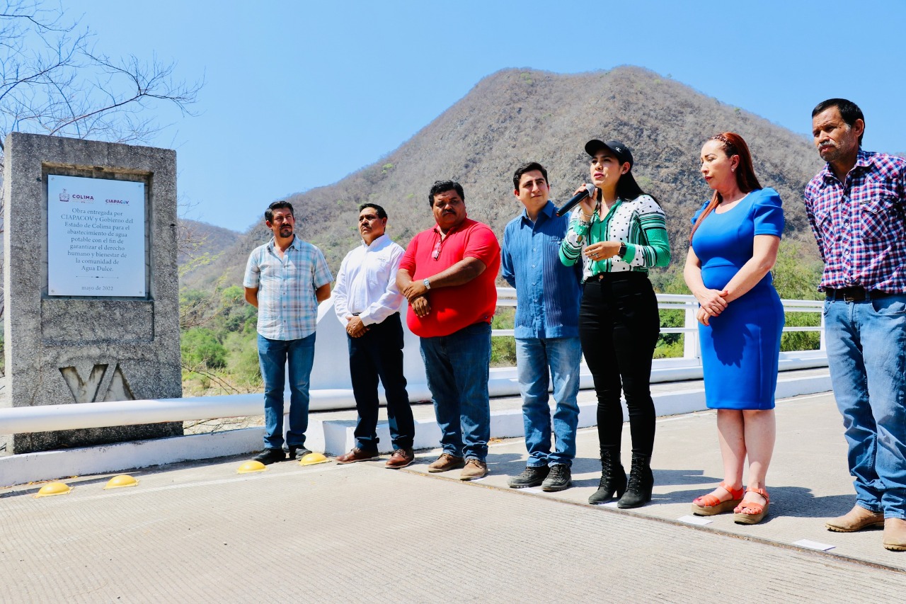 La gobernadora, Indira Vizcaíno Silva, entregó este jueves en la comunidad rural de Agua Dulce, municipio de Villa de Álvarez, una obra de infraestructura con la que se restableció el servicio de agua potable, luego de que un tramo de más de 220 metros de tubería resultara dañado por el paso del huracán Nora, en agosto de 2021; la inversión fue por alrededor de 200 mil pesos y la obra se realizó con maquinaria y personal de la Comisión Intermunicipal de Agua Potable y Alcantarillado de Colima y Villa de Álvarez (Ciapacov).