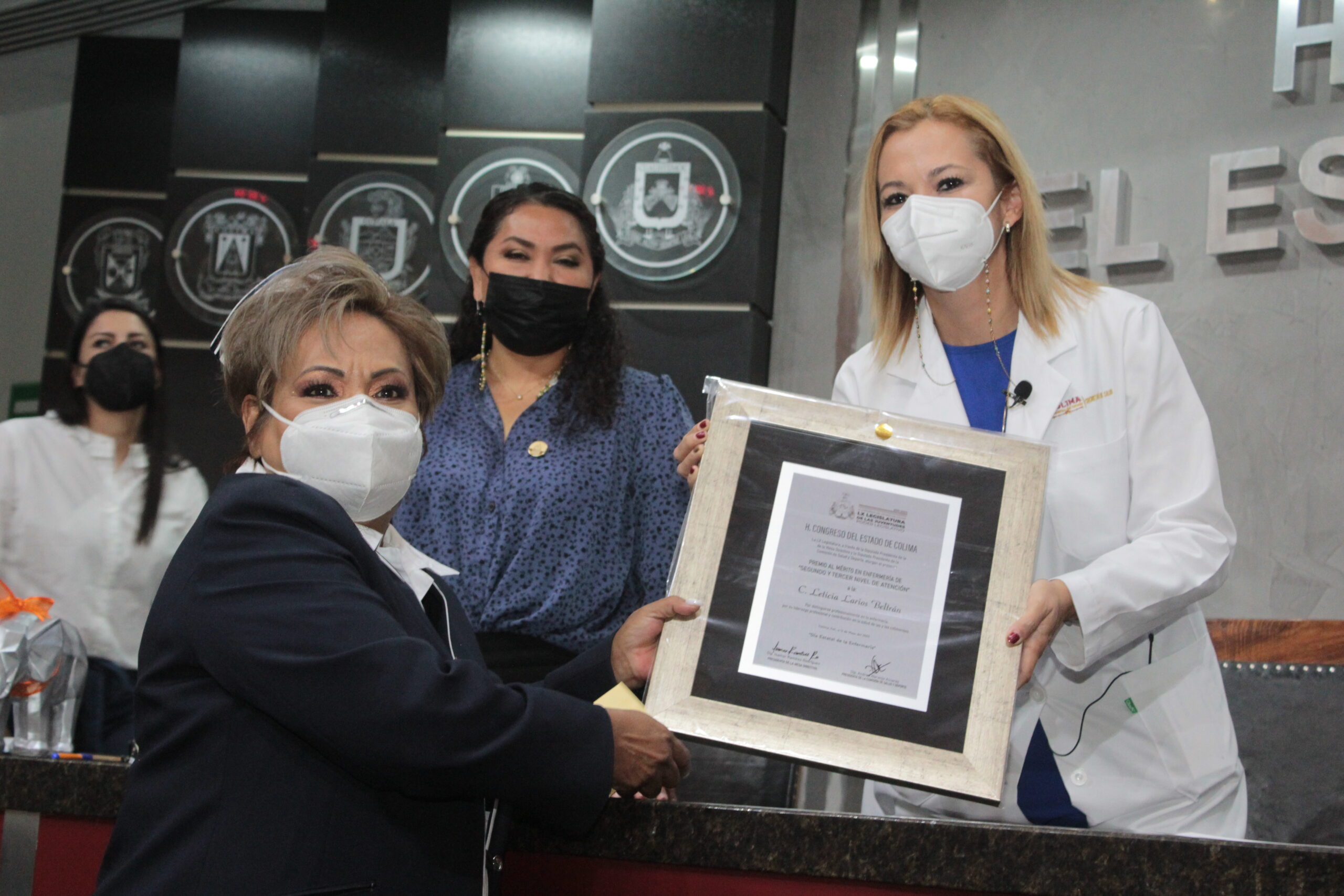 En esta sesión, en la que el Congreso del Estado entregó un reconocimiento especial a la secretaria de Salud por su colaboración en el comité calificador de este premio, las diputadas Isamar Ramírez Rodríguez, presidenta del Congreso, Andrea Naranjo Alcaraz y Myriam Gudiño Espíndola agradecieron al personal de enfermería su labor y su sacrificio en la atención de los pacientes, en particular durante la pandemia de Covid-19.