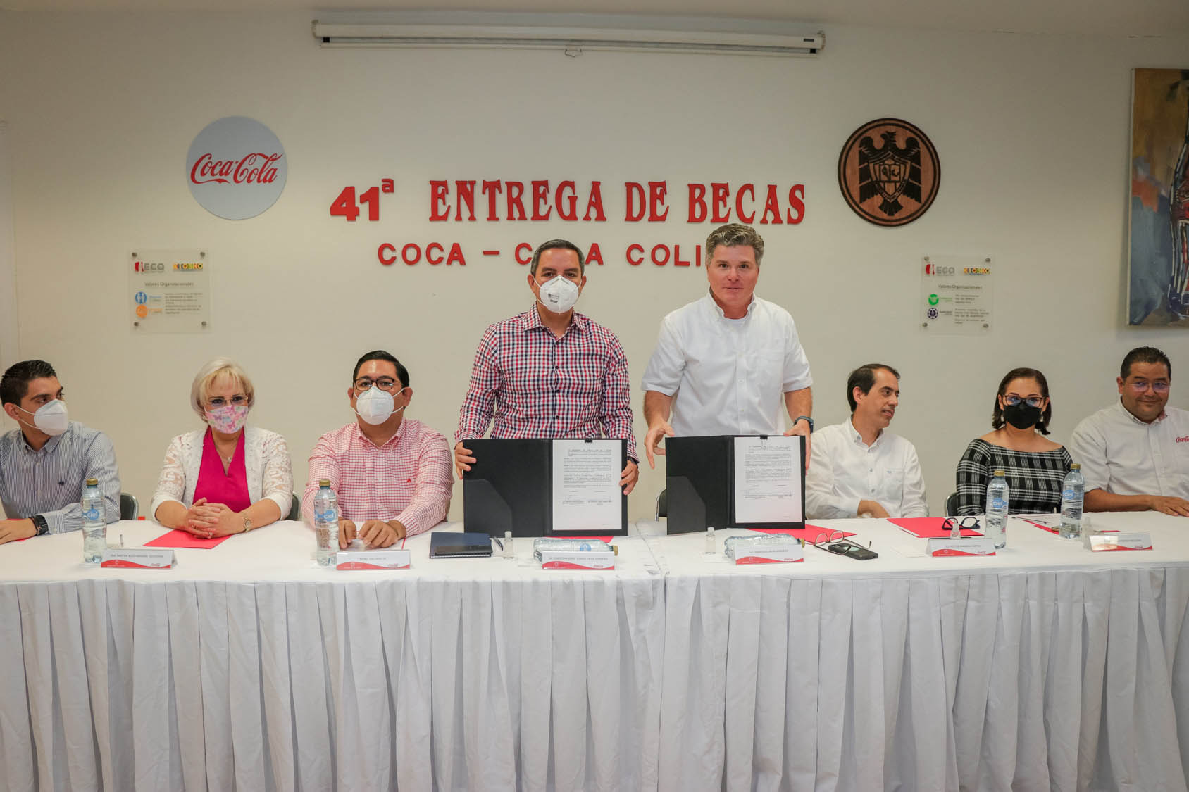 Durante la entrega de 200 becas Coca-Cola a estudiantes de 21 planteles del nivel superior realizada este viernes, la empresa embotelladora, representada por Francisco Brun González y la Universidad de Colima, representada por su rector, Christian Jorge Torres Ortiz Zermeño, firmaron un convenio de colaboración para seguir otorgando este tipo de apoyos a las y los jóvenes que desean continuar sus estudios.