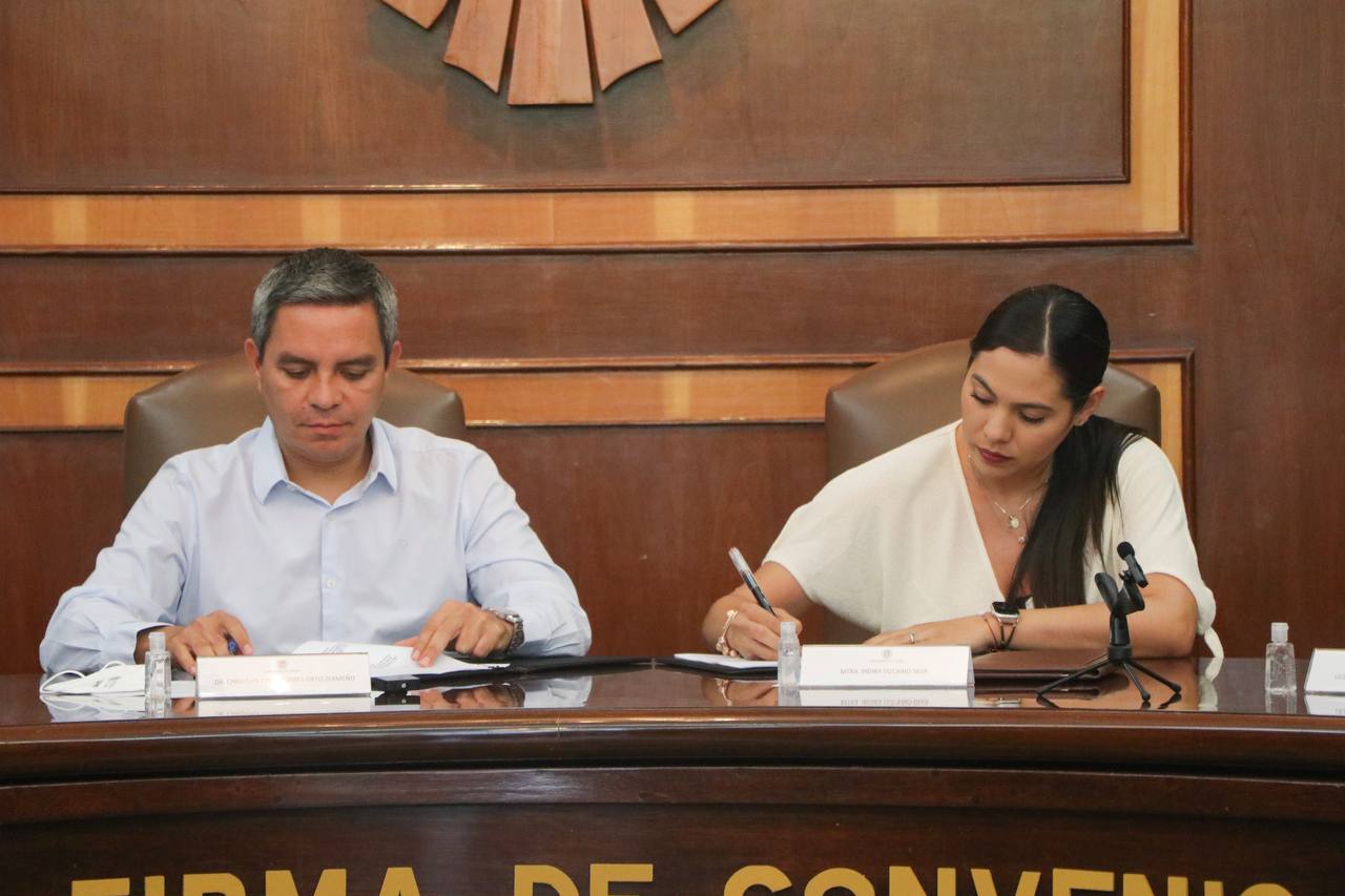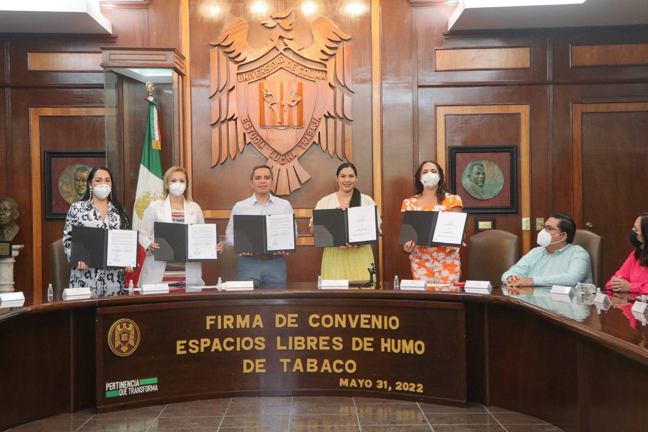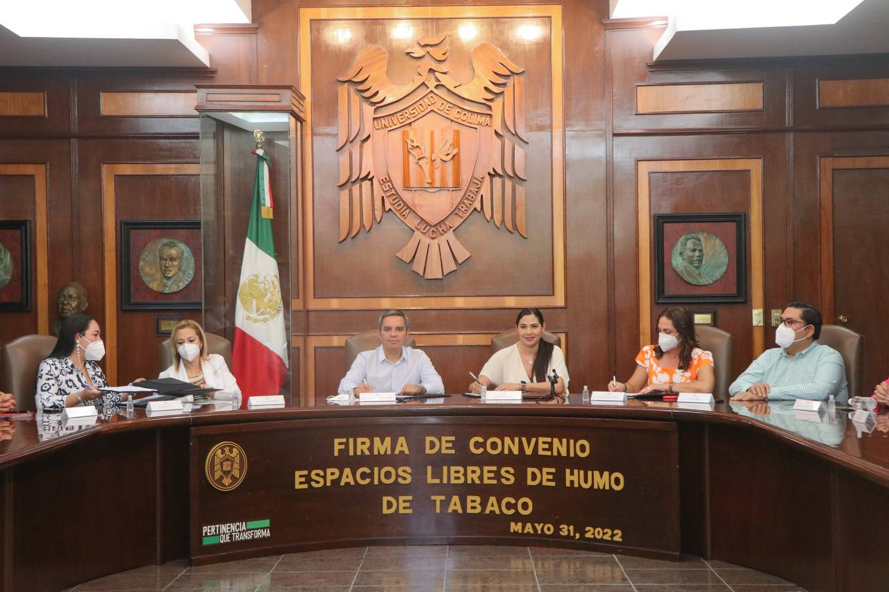 La gobernadora, Indira Vizcaíno Silva y el rector de la Universidad de Colima (UdeC), Christian Jorge Torres Ortiz Zermeño, firmaron la tarde de este martes, junto con las titulares de la Secretaría de Salud, la Comisión Estatal para la Protección contra Riesgos Sanitarios (Coespris) y el Voluntariado UdeC, el convenio interinstitucional del programa “Espacios libres de humo de tabaco y emisiones”, en la máxima casa de estudios.