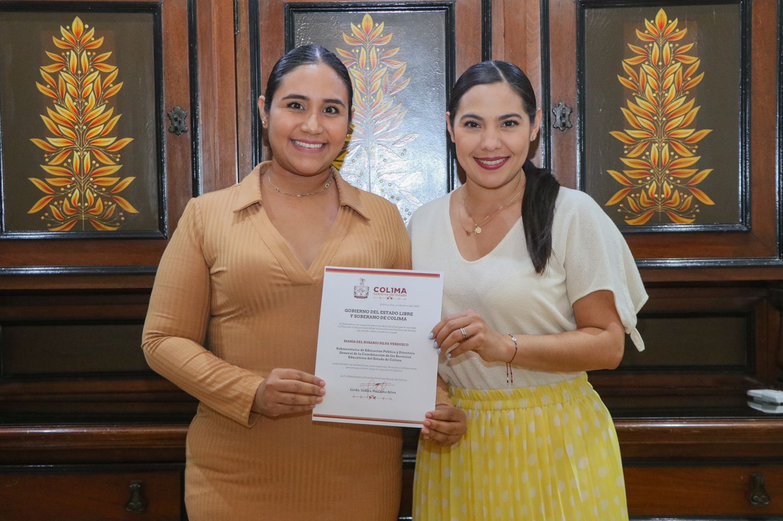 La mandataria colimense, en uso de las atribuciones que le confiere la ley, entregó la noche del martes los nombramientos a Dulce Huerta como secretaria de Bienestar, Inclusión Social y Mujeres, en sustitución de Rosario Silva, quien a su vez fue designada subsecretaria de Educación Pública.