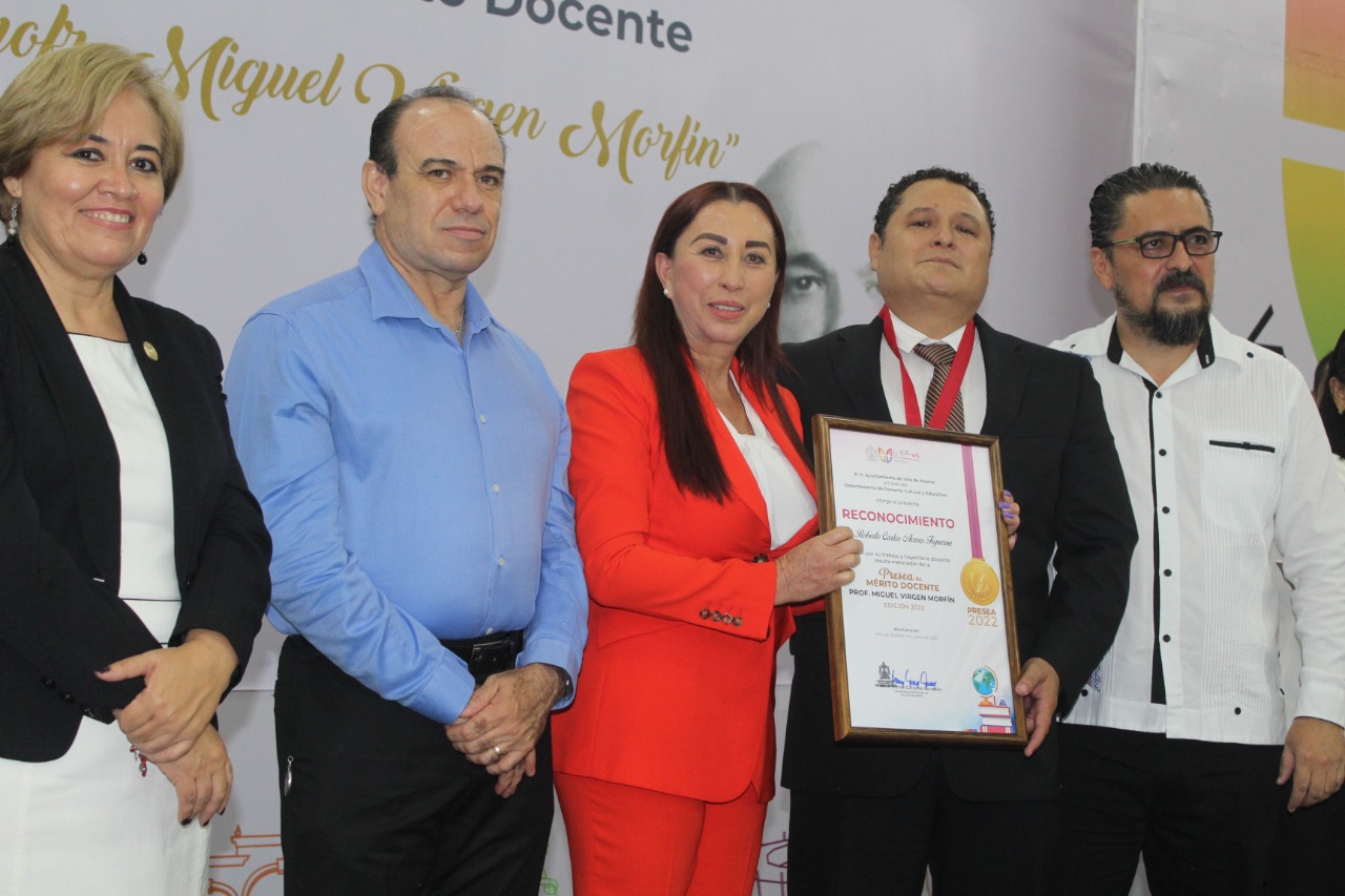 En el Salón Presidentes de Casa de la Cultura, y ante autoridades educativas, sindicales, los diputados Miguel Ángel Galindo y Jesús Dueñas, la diputada Miriam Gudiño, el síndico, regidoras, regidores, hijos del Profesor Miguel Virgen Morfín y buena parte del magisterio villalvarense, la Alcaldesa Tey Gutiérrez entregó la Presea, un reconocimiento y un estímulo económico al Maestro Roberto Carlos Aceves Figueroa, quien destacó entre 13 propuestas recibidas.