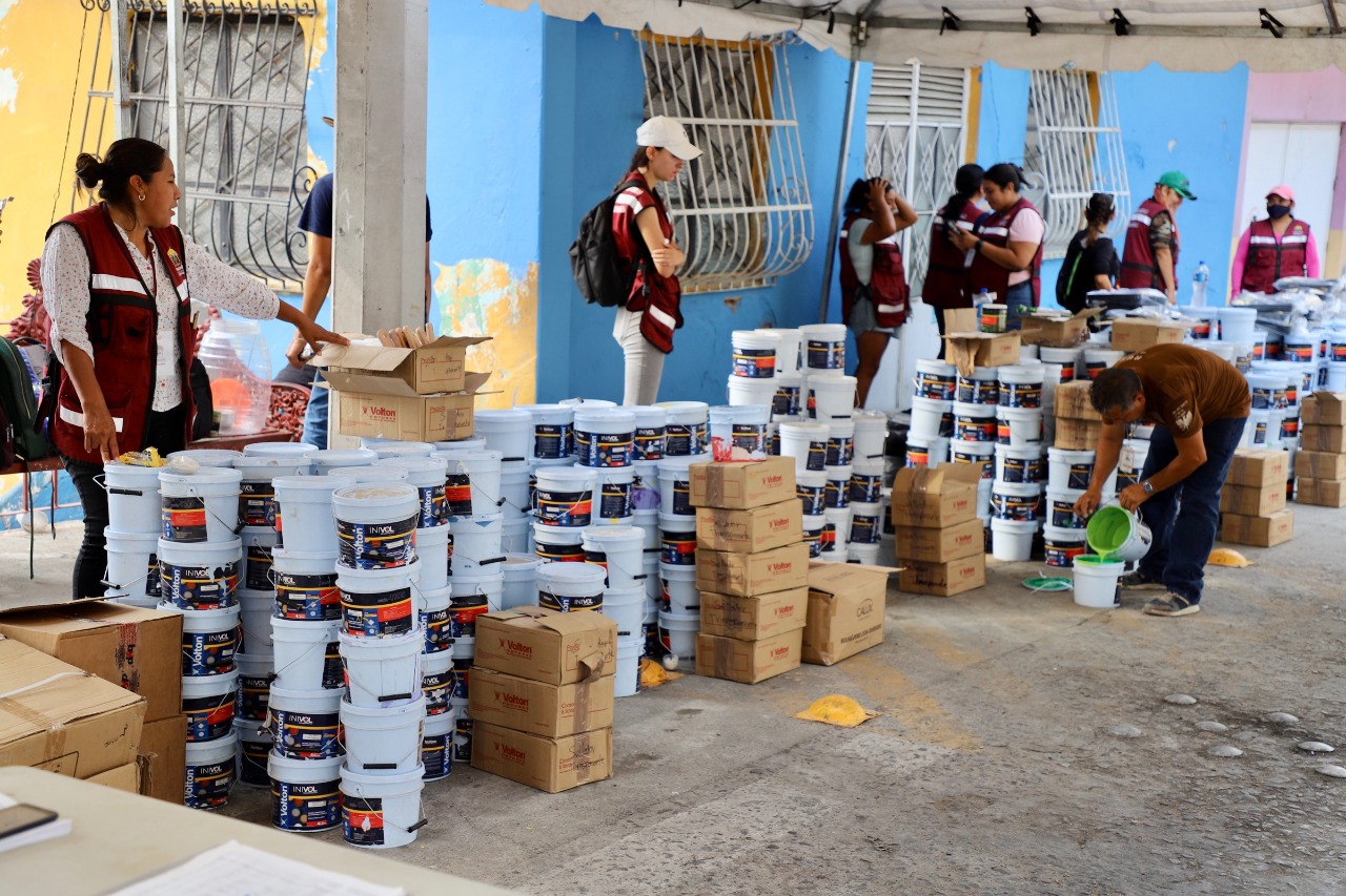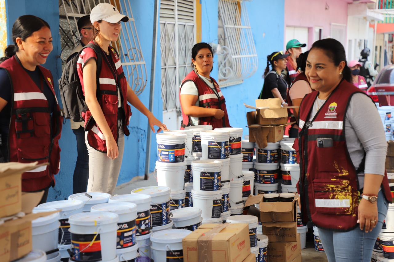 La presidenta Griselda Martínez participó en la jornada que el ayuntamiento de Manzanillo organizó a través de la dirección de Participación Ciudadana y Desarrollo Comunitario, la cual benefició a 114 familias habitantes del Sector 3 Providencia a quienes se les otorgó pintura para mejorar las fachadas de sus hogares y volver un entorno urbano más bonito.