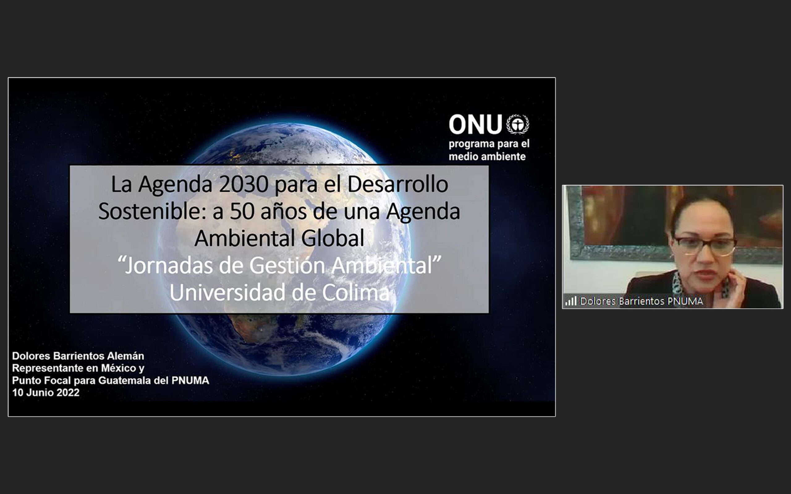 Como uno de los eventos centrales de las primeras Jornadas de Gestión Ambiental de la Universidad de Colima, este fin de semana Dolores Barrientos Alemán, representante en México y Guatemala del Programa de la Naciones Unidas para el Medio Ambiente (PNUMA), impartió la conferencia virtual: “La Agenda 2030 para el Desarrollo Sostenible: a 50 años de una Agenda Ambiental Global”.