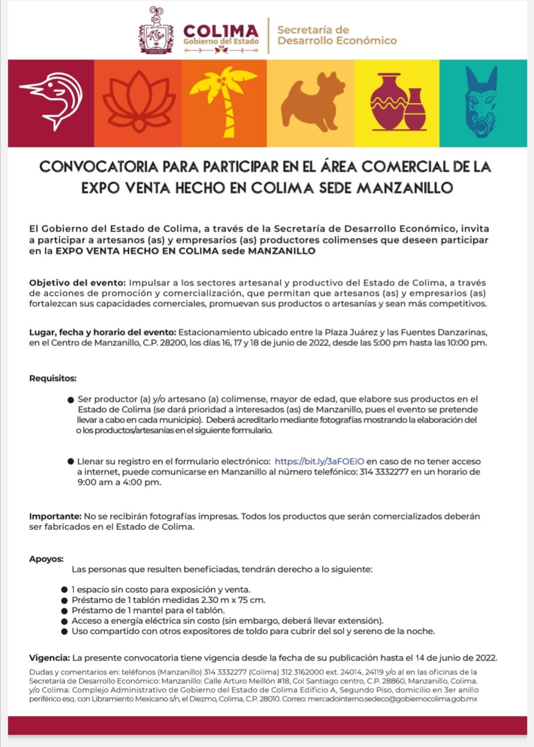Para mayor información, quienes estén interesadas o interesados en participar, pueden acudir a las oficinas de la Secretaría de Desarrollo Económico (sede Manzanillo), en la calle Arturo Meillón #18, delegación Santiago centro, en Manzanillo, o bien al teléfono 314 333 2277 y a los celulares: 314 107 0656, 314 163 5334 y 314 148 0684. Y al correo electrónico [email protected]