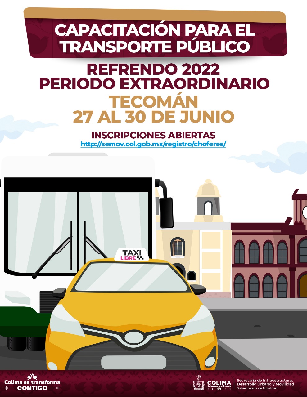 El Gobierno del Estado de Colima, a través de la Subsecretaría de Movilidad, informa que la capacitación para el gremio del transporte público (Refrendo 2022) tendrá un periodo extraordinario para aquellas personas que, por diversas razones, no tomaron su capacitación anual, durante el plazo ordinario.