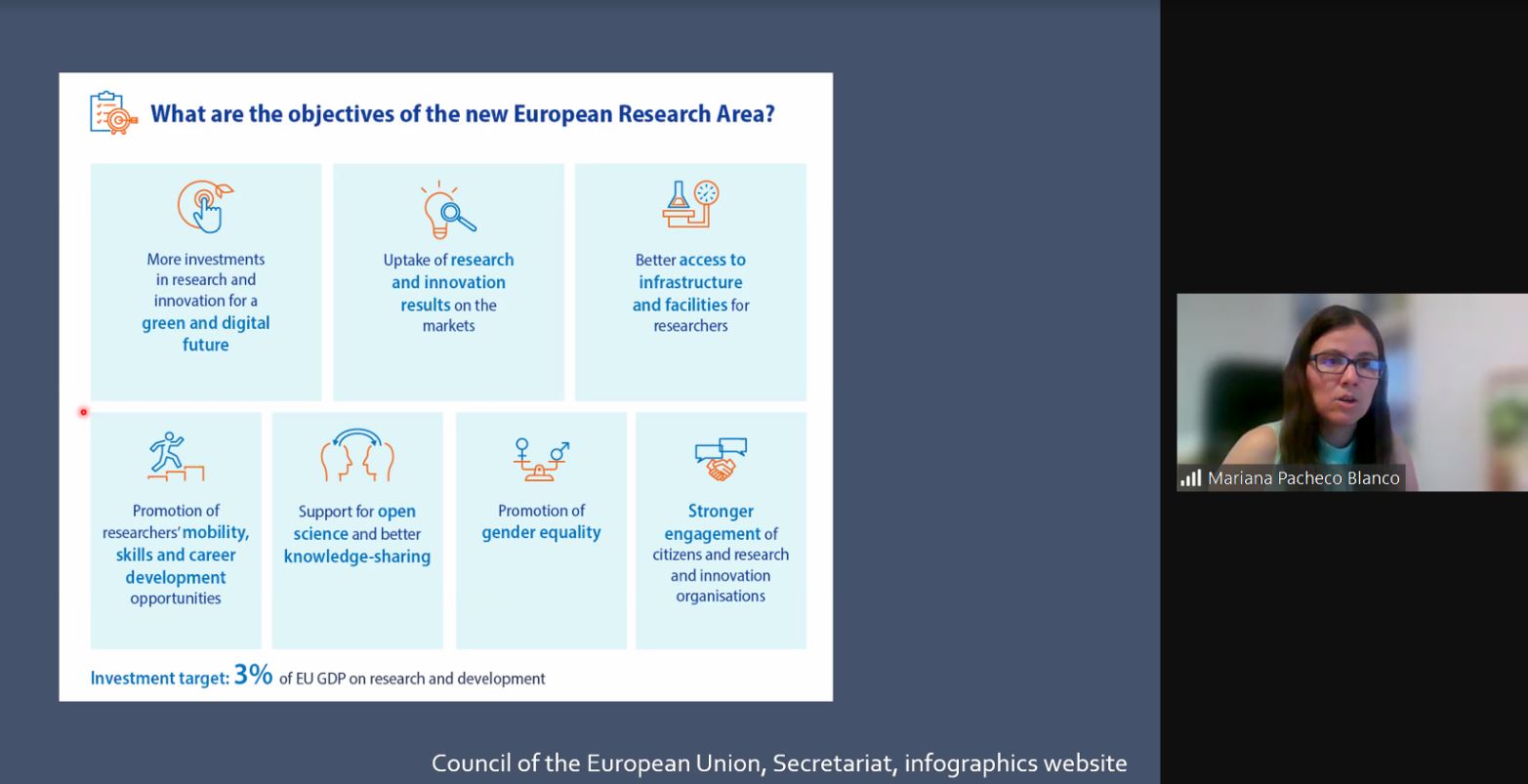 También habló de las innovaciones e investigaciones factibles de ser apoyadas por Europa, como el futuro digital y verde, mercados (economía y trabajo), infraestructura para investigación, movilidad de investigadores, habilidades y desarrollo de carreras, ciencia abierta y mejor intercambio de conocimientos, promoción de la equidad de género, etcétera.