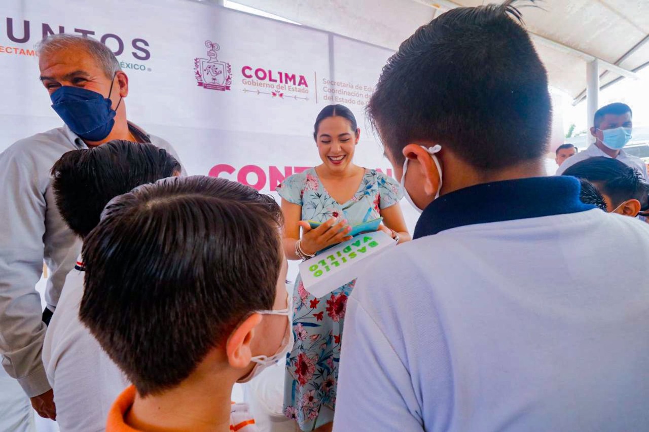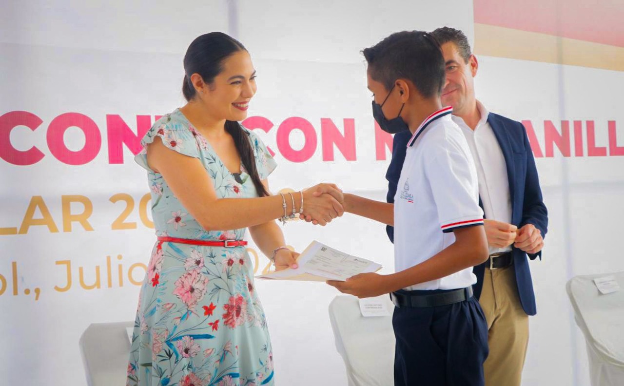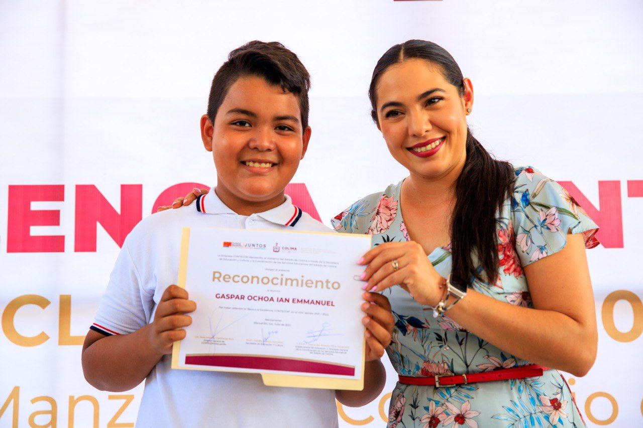 Así lo resaltó al participar en la entrega de Becas de Excelencia Contecon 2022, a 17 estudiantes de sexto grado de primaria en la escuela Basilio Vadillo de Manzanillo, donde estuvo acompañada por el secretario de Educación y Cultura, Adolfo Núñez González; el director general de Contecon Manzanillo, José Antonio Contreras Ruiz; el jefe de Responsabilidad Social Corporativa de esta empresa, Francisco Santana Roldán y la directora del plantel, Luxiola Cárdenas Alcaraz.
