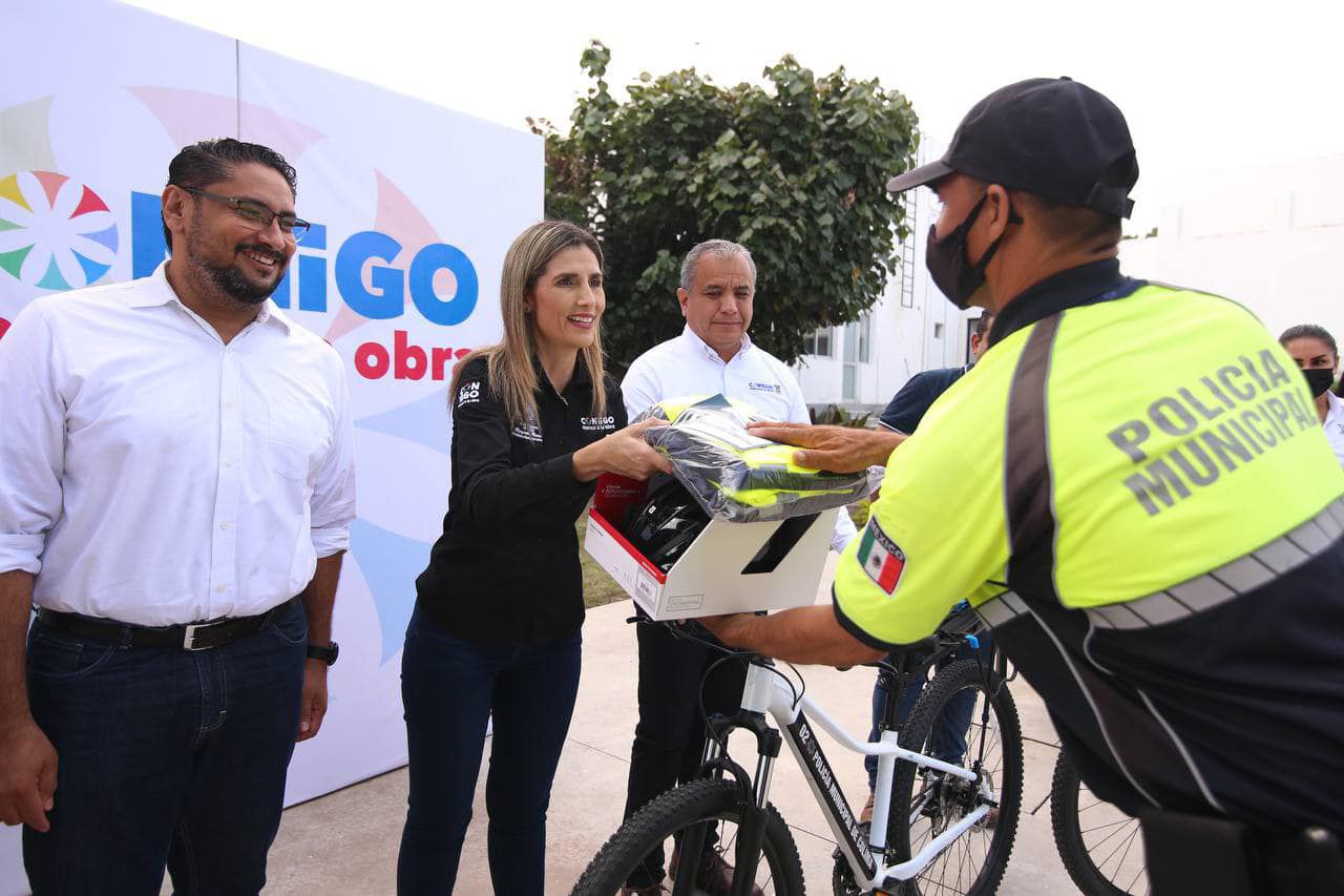 La presidenta municipal de Colima, Margarita Moreno, entregó 10 bicipatrullas, con las cuales se completa el equipo de los elementos que realizan trabajos de vigilancia, proximidad social y orientación a la ciudadanía en la zona centro de la capital.