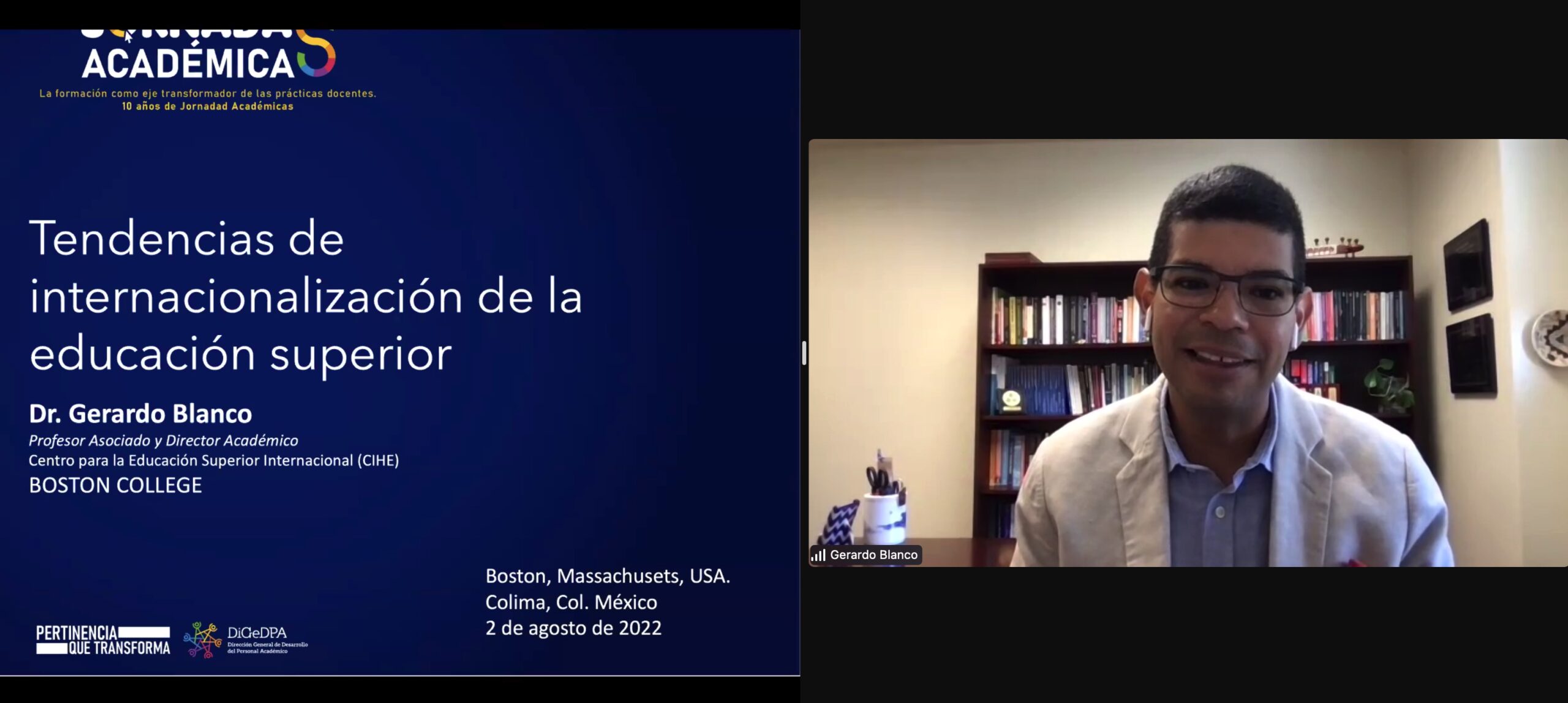 En su conferencia, Gerardo Blanco Ramírez, profesor asociado y director académico del Centro para la Educación Superior Internacional del Boston College, reconoció que en la UdeC existe ya un camino recorrido en el tema de la internacionalización, al incluirla como parte de una planeación estratégica institucional; sin embargo, invitó a todos y todas “a reflexionar sobre cómo es que estamos imaginando la internacionalización en esta postpandemia, de modo tal que todo lo que habíamos construido y desarrollado como universidades tenga que pensarse desde una perspectiva nueva, acorde a nuestra nueva realidad”.