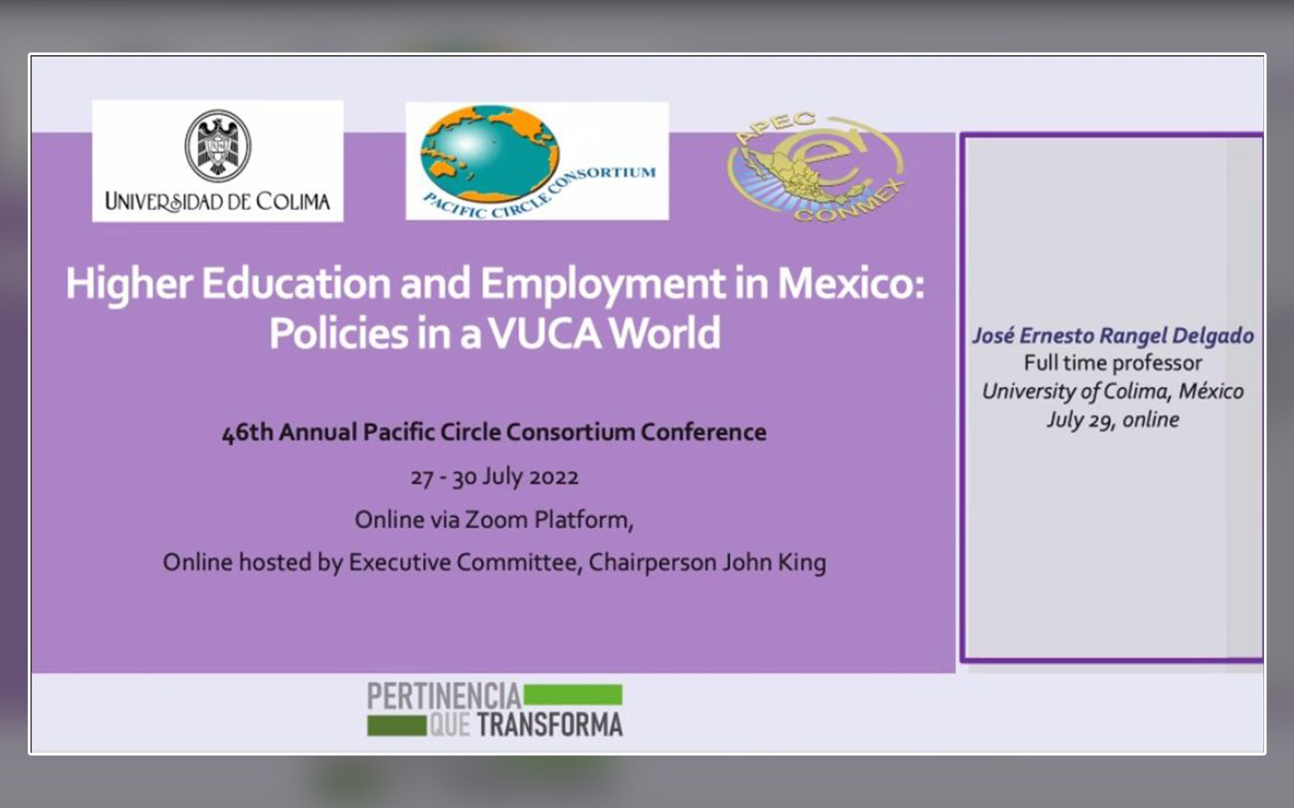 Con la conferencia “Educación Superior y empleo en México: políticas para un mundo VUCA”, el Dr. José Ernesto Rangel Delgado, director del Centro Universitario de Estudios e Investigaciones sobre la Cuenca del Pacífico-Centro de Estudios APEC (CUEICP-CEAPEC) y profesor investigador de la Facultad de Economía, participó en la 46 Conferencia Anual del Consorcio Círculo del Pacífico (Pacific Circle Consortium, PCC) 2022.